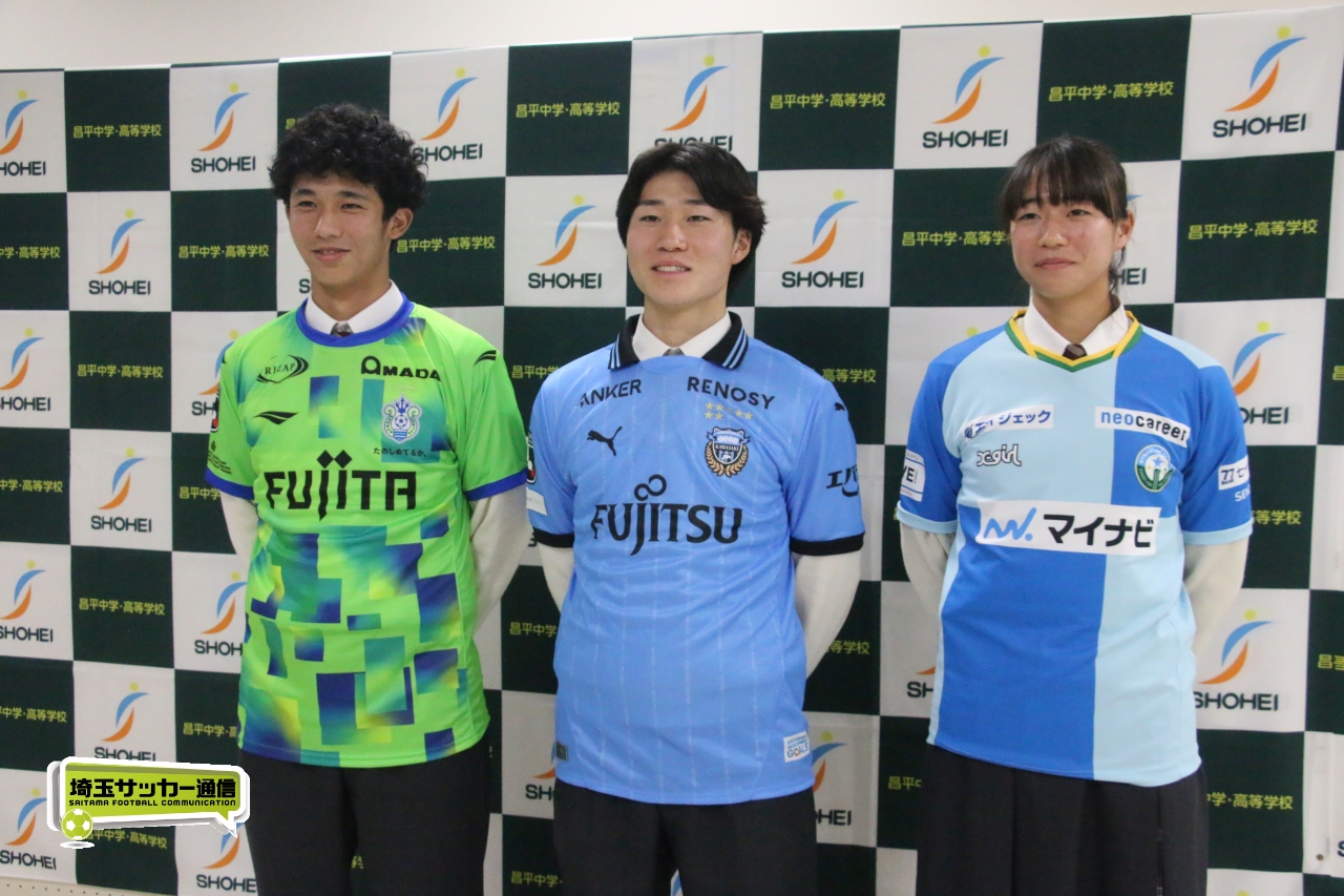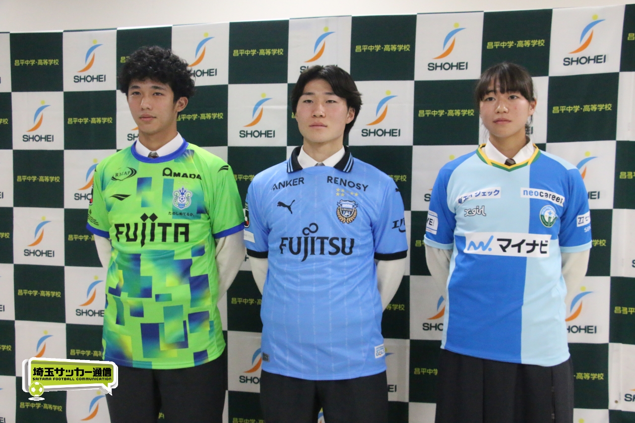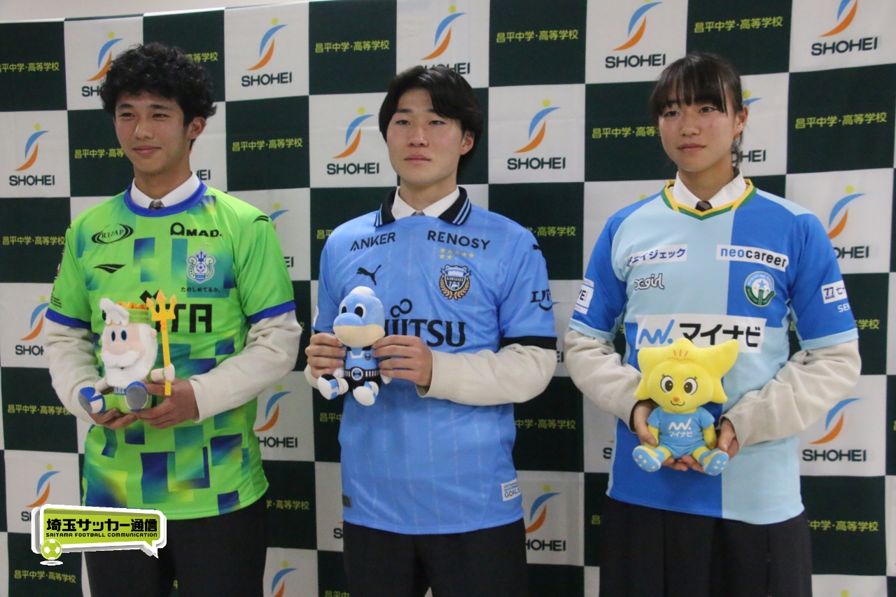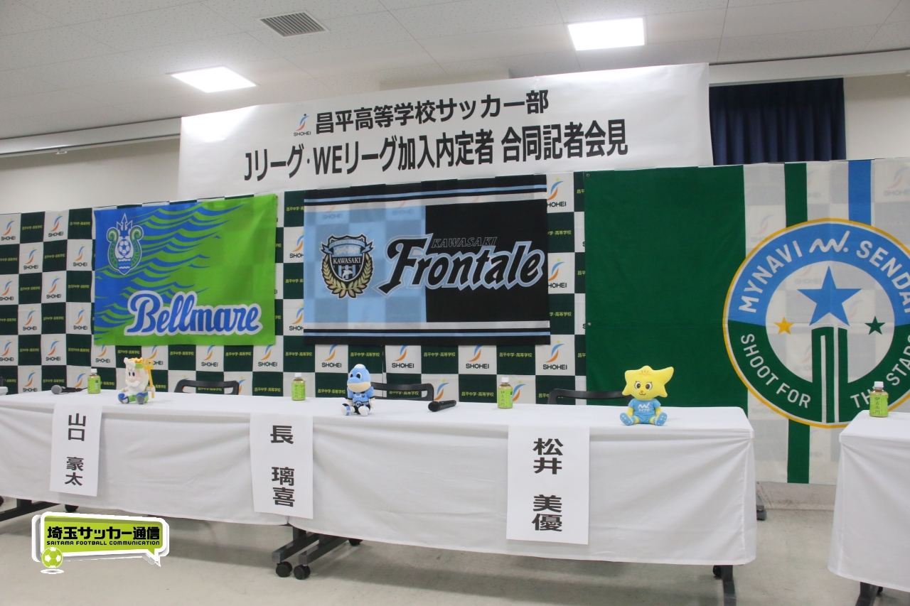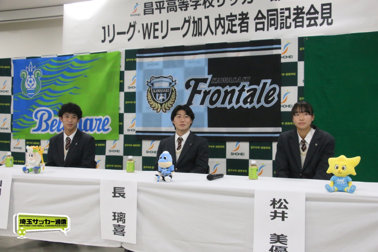 昌平高サッカー部は22日、杉戸町の同校にて「Jリーグ・WEリーグ加入内定者合同記者会見」を行った。男子サッカー部からは湘南ベルマーレ内定のMF山口豪太(3年)、川崎フロンターレ内定のMF長璃喜(3年)、女子サッカーからはマイナビ仙台レディース内定のFW松井美優(3年)のほか、学校関係者や加入内定チーム代表者が出席。各選手が将来の抱負などを語った。