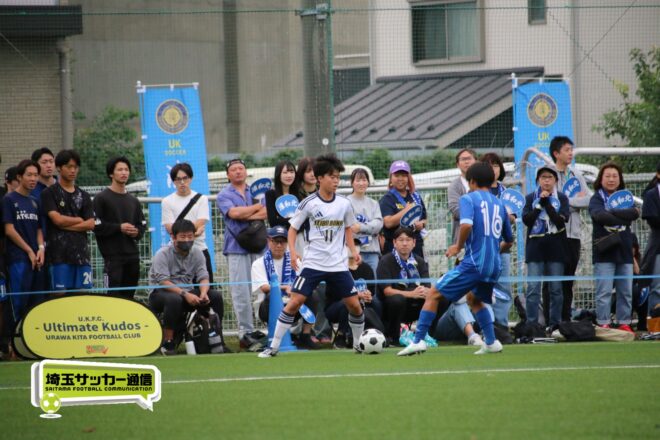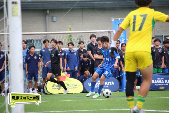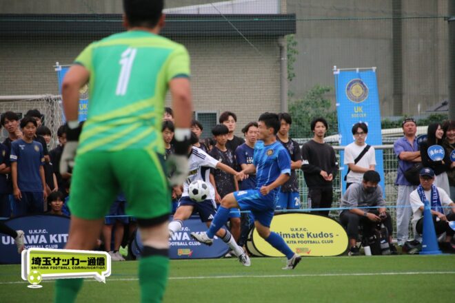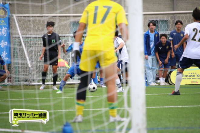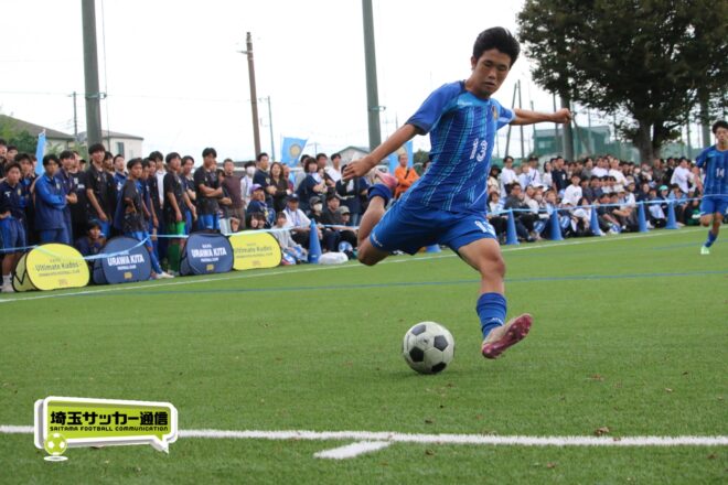 浦和北は後半立ち上がりに続けて右サイドからチャンスメイク。4分、千葉のクロスにFW清水凰輔(3年)が合わせると、5分にはエリア内で千葉が相手DFを外しクロスでゴールに迫る。