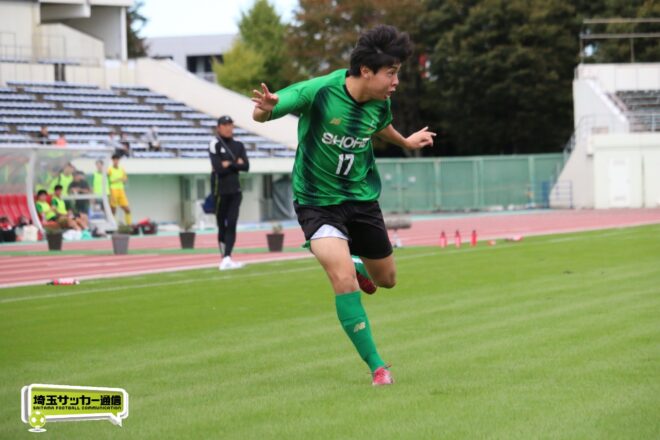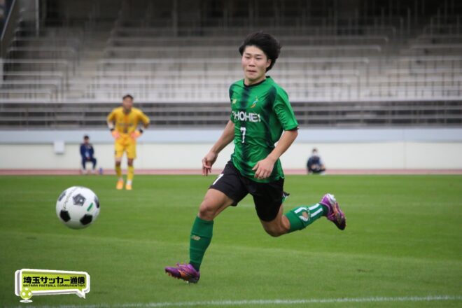 33分には左SHの桜井亮(2年)のパスから裏抜けしたFW本田優生(3年)がシュート。これは昌平GK小野寺太郎(3年)が防いだが、その3分後に浦和学院は左SB町田璃斗(3年)が1人剥がして前方のスペースに出すと、ボールを受けたボランチの平方虎(3年)が果敢に仕掛けてエリア内に潜り込み、最後は角度のないところから左足でニア上を打ち抜いて先制した。
