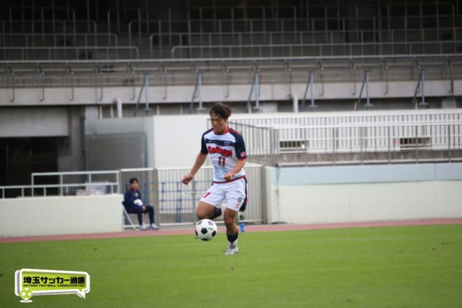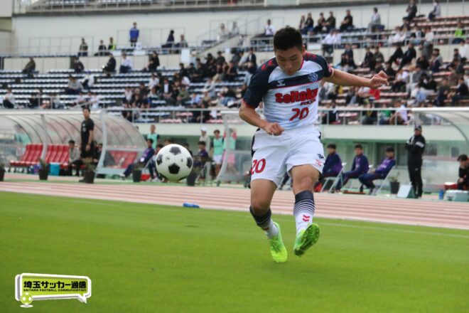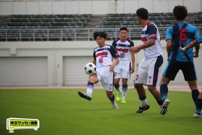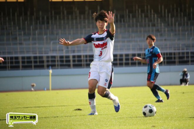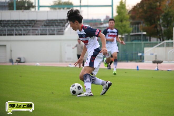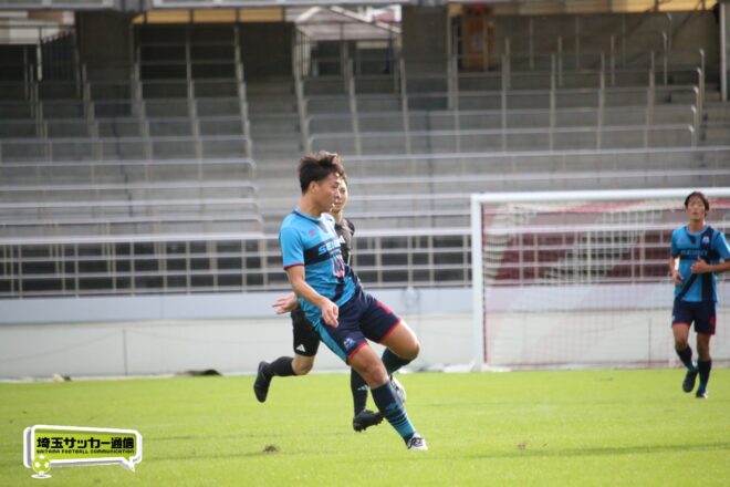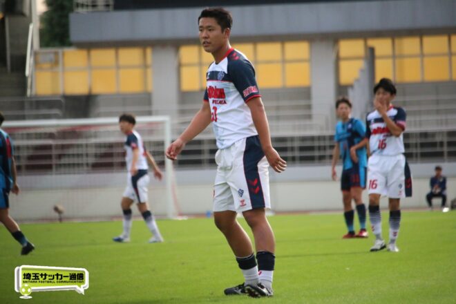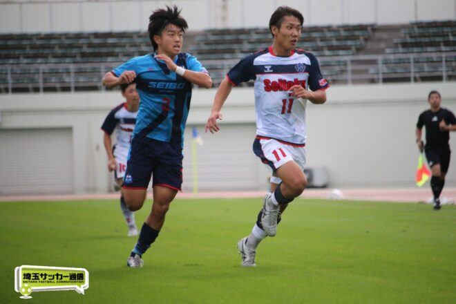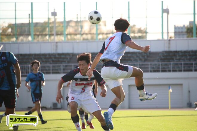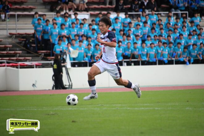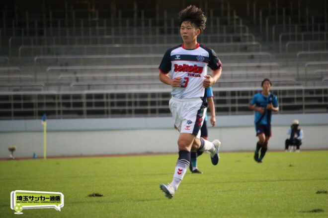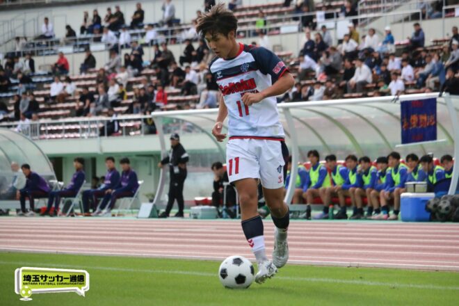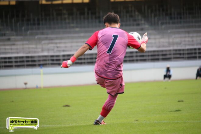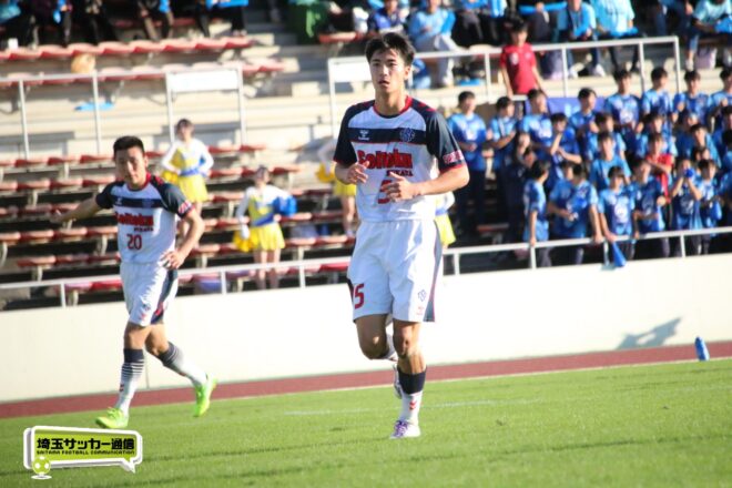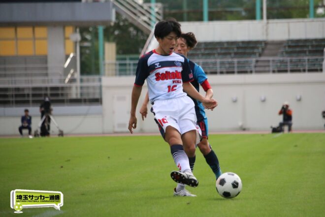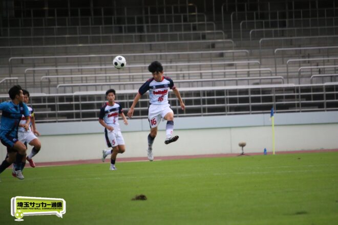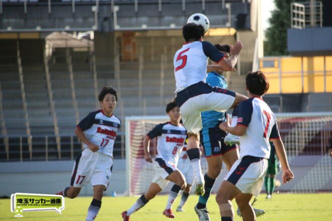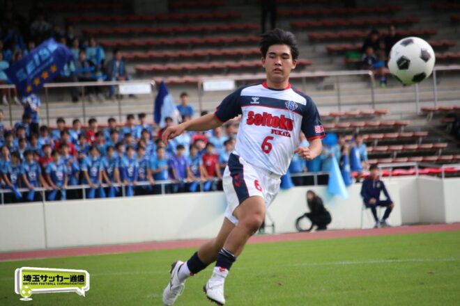 成徳深谷は2トップに当てながら、回収力のあるMF朝烏真大(3年)主将や2列目がボールを拾って攻撃。190cmの長身FW頓宮は相手にとって脅威となっていた。29分には中盤で頓宮が落とし、MF吉田佑樹(3年)のパスに抜け出した川上の右足シュートが左ポストを強襲した。