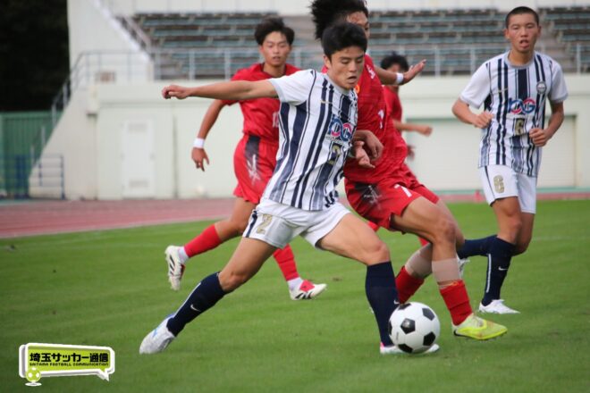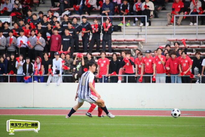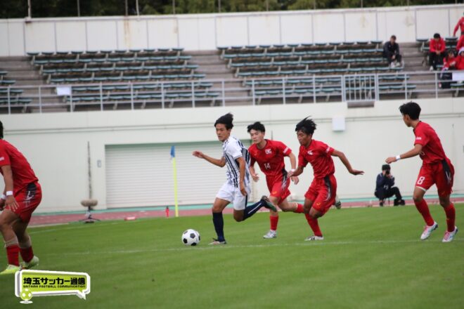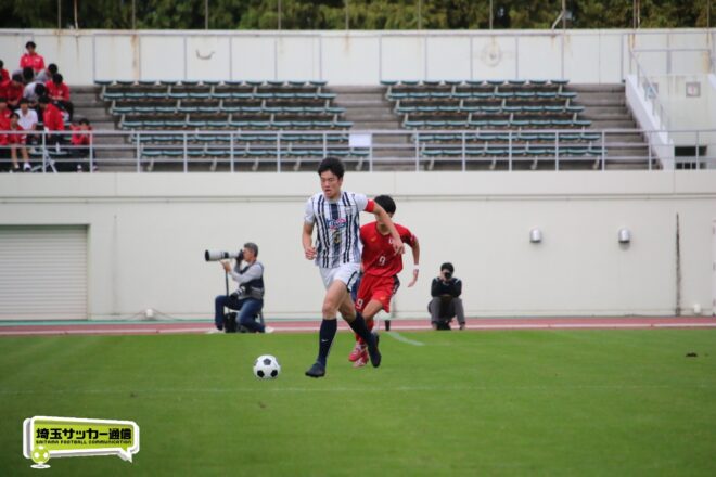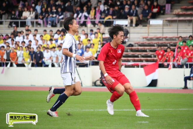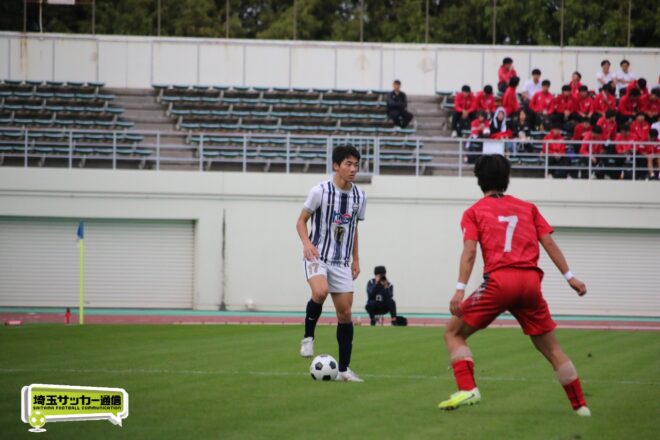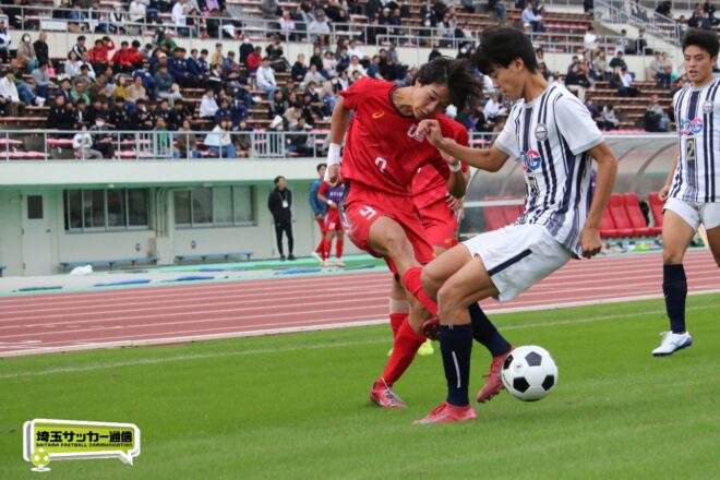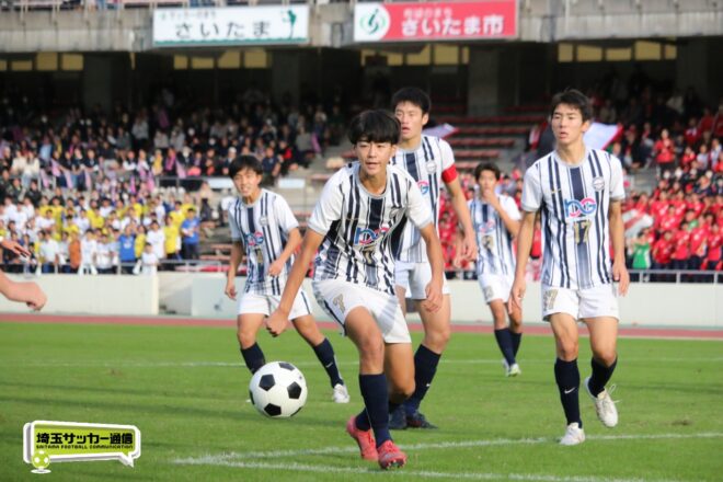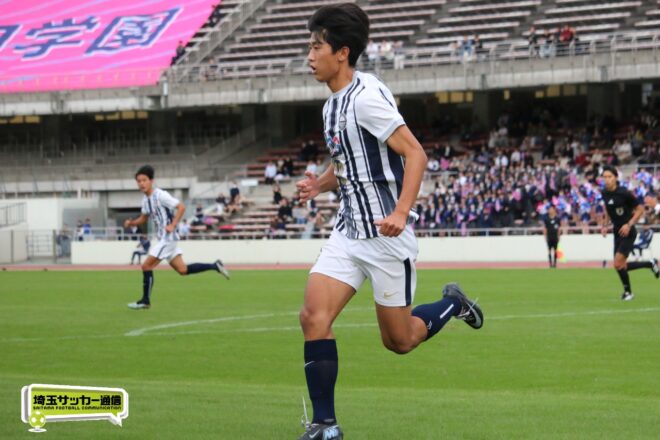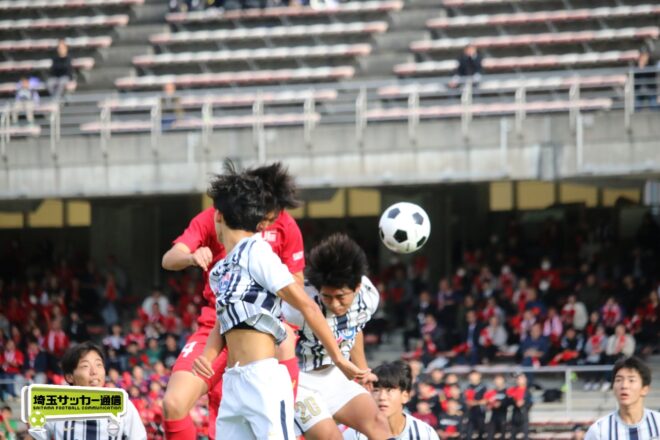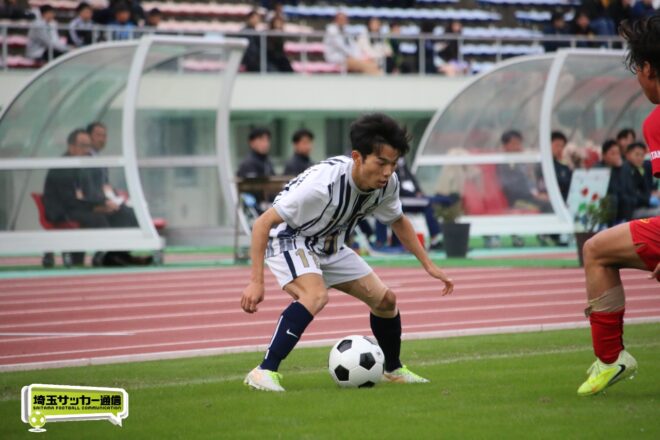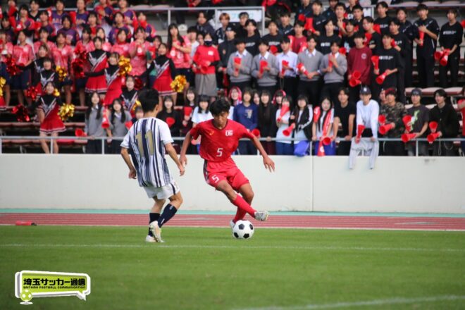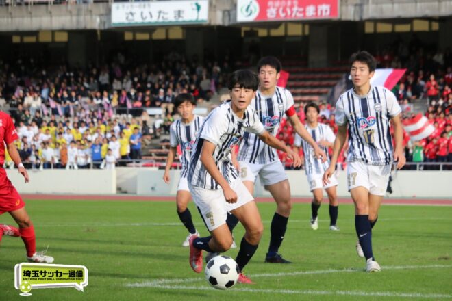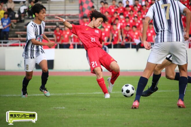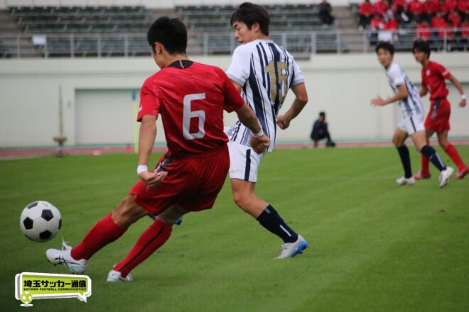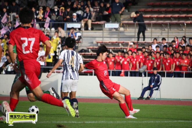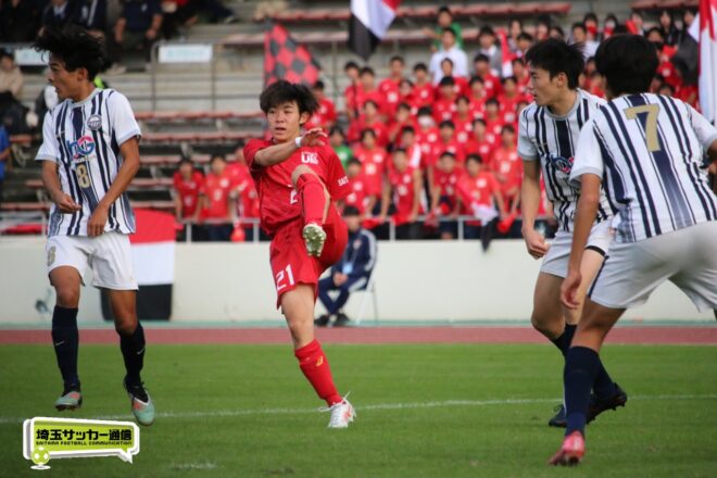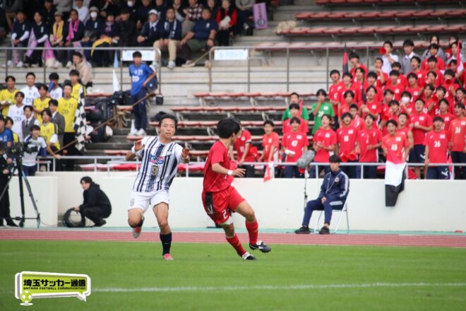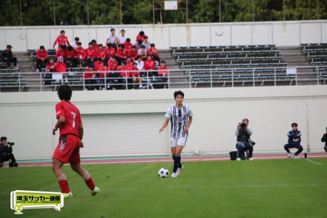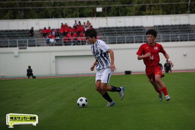 一方、浦和東はFW金響生(3年)、MF谷口大河(3年)、MF藤井慶太(3年)の前線3枚を中心にハイプレス。ロングボールや切り替えの早い攻撃で相手ゴールに迫ろうと試みる。前半14分には中盤でボールを捕まえ、谷口と繋ぎ、藤井が中央から運び出し左足シュートを見舞った。