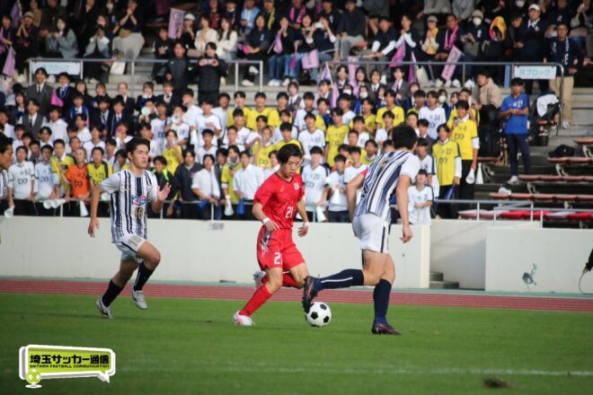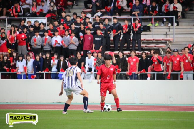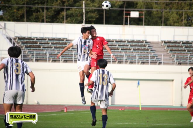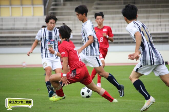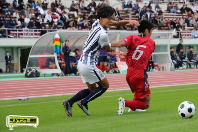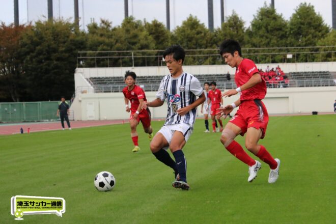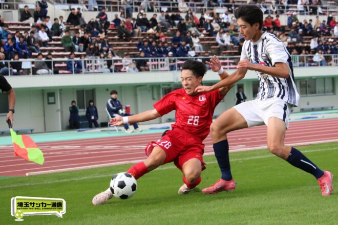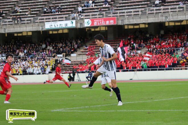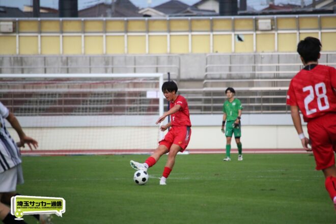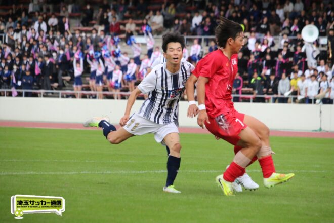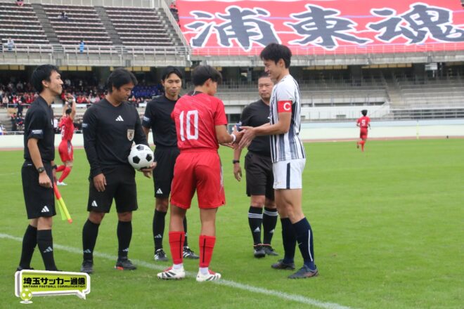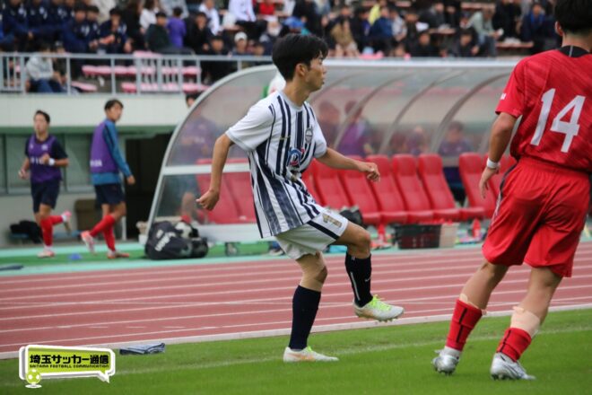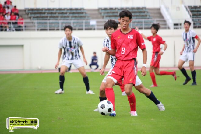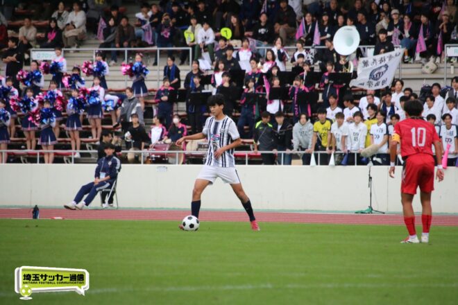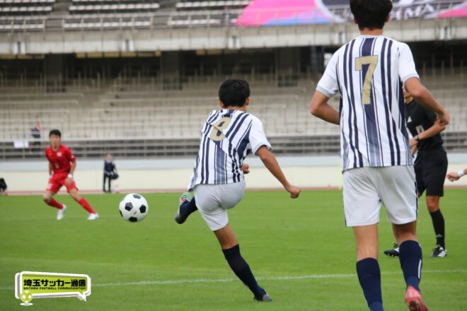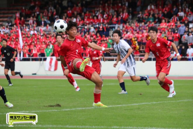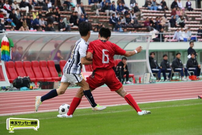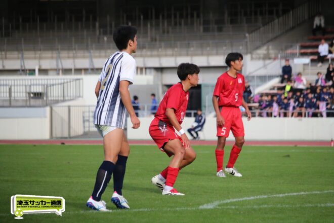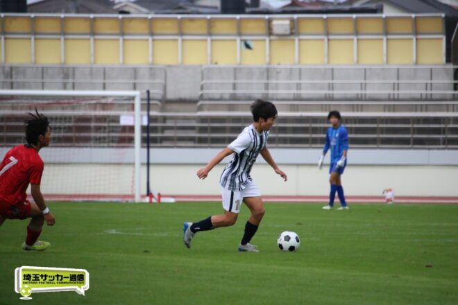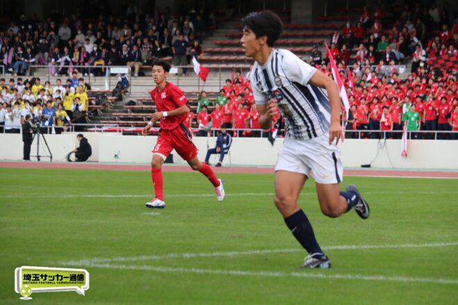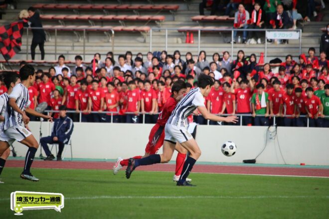 一方、浦和東はFW金響生(3年)、MF谷口大河(3年)、MF藤井慶太(3年)の前線3枚を中心にハイプレス。ロングボールや切り替えの早い攻撃で相手ゴールに迫ろうと試みる。前半14分には中盤でボールを捕まえ、谷口と繋ぎ、藤井が中央から運び出し左足シュートを見舞った。
