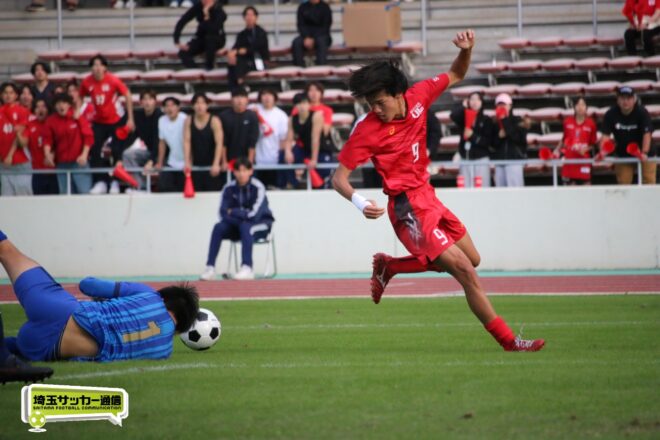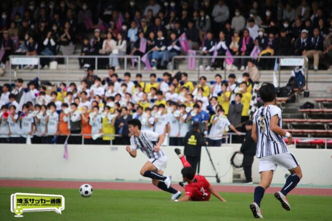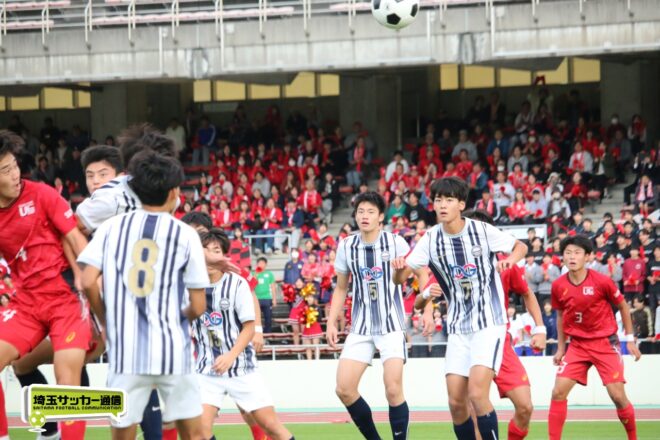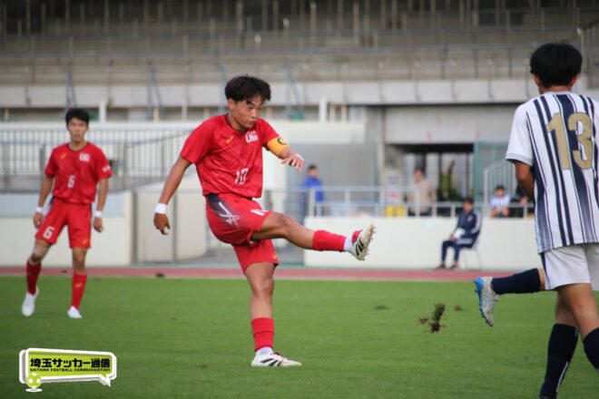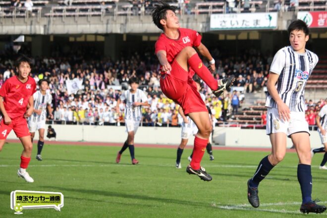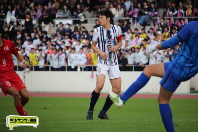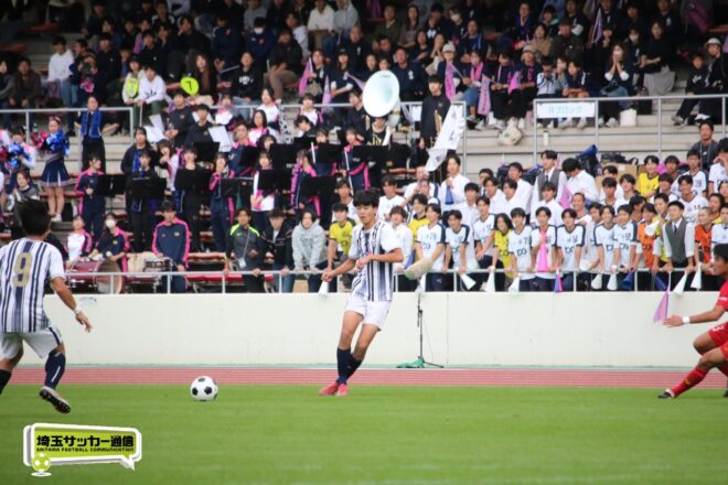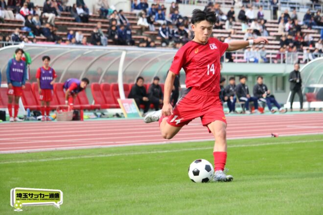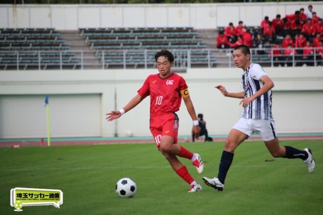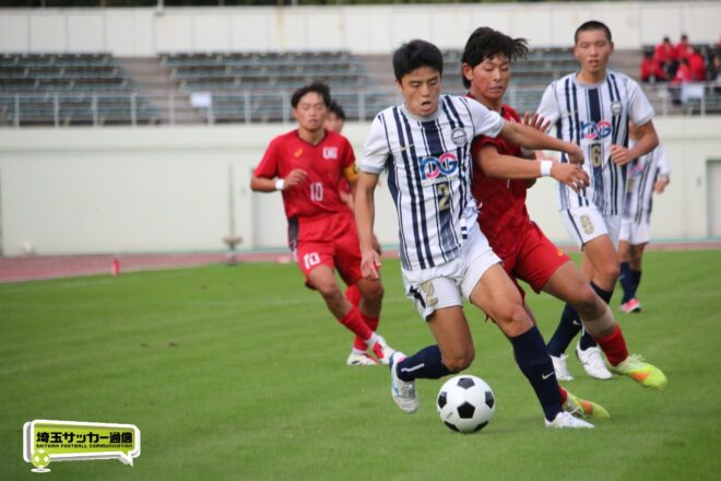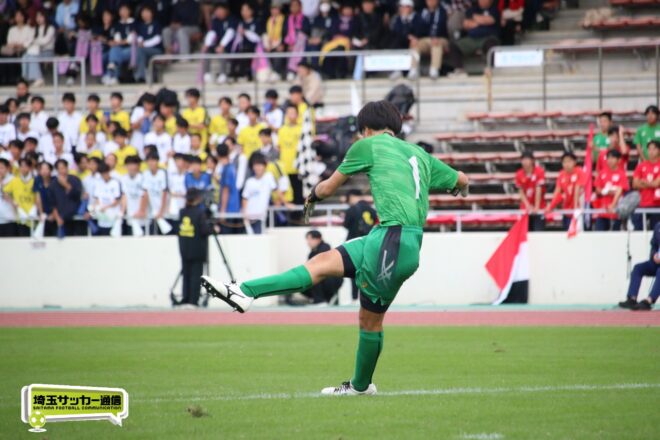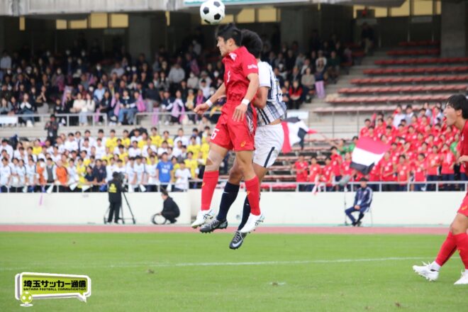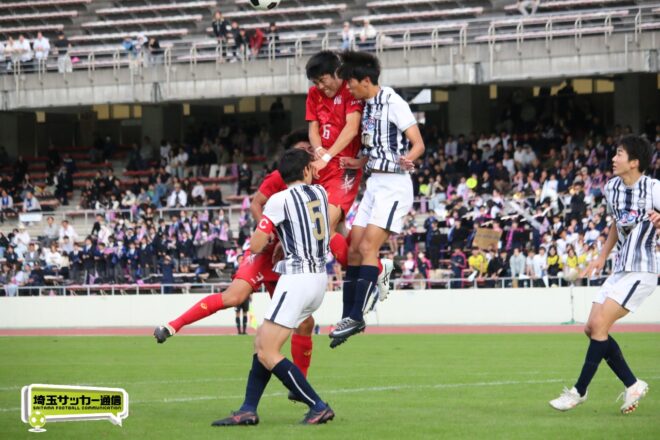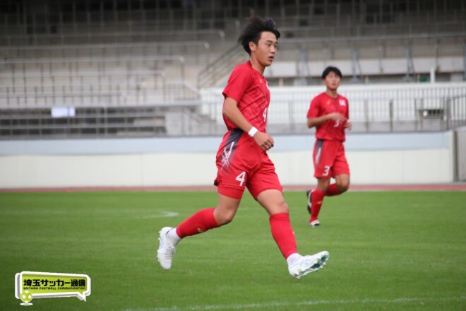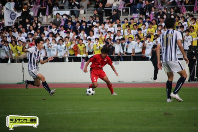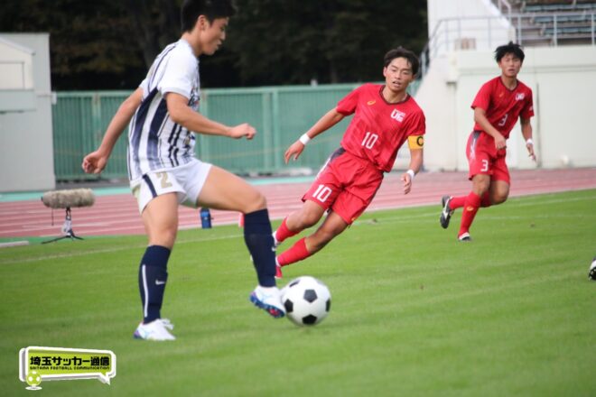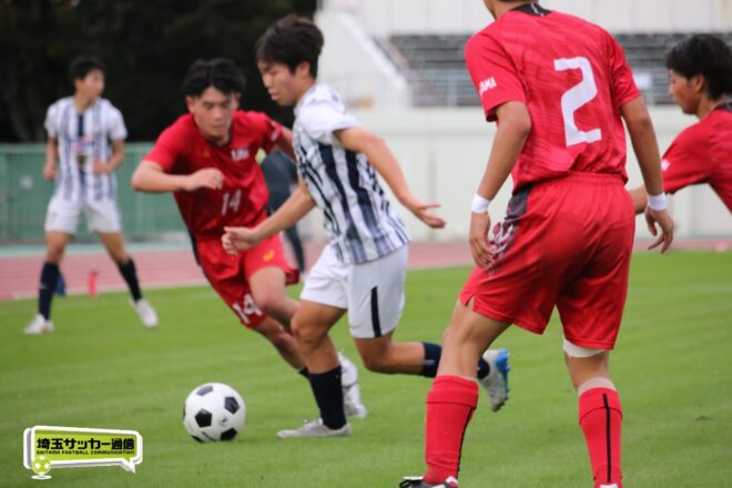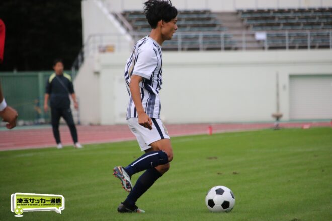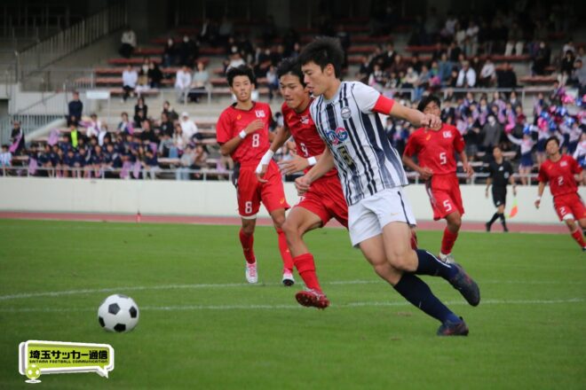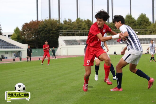 一方、浦和東はFW金響生(3年)、MF谷口大河(3年)、MF藤井慶太(3年)の前線3枚を中心にハイプレス。ロングボールや切り替えの早い攻撃で相手ゴールに迫ろうと試みる。前半14分には中盤でボールを捕まえ、谷口と繋ぎ、藤井が中央から運び出し左足シュートを見舞った。