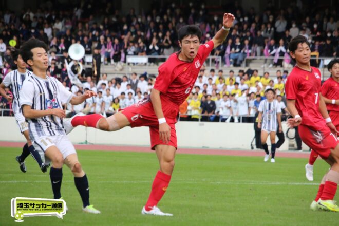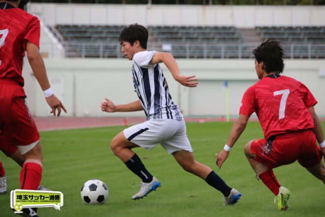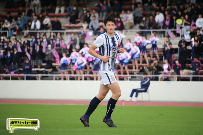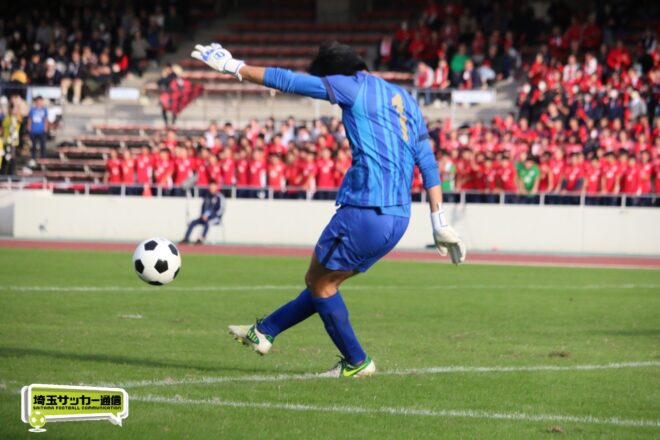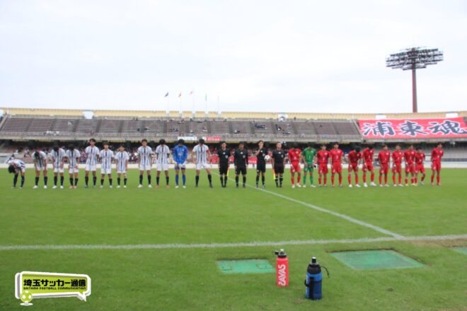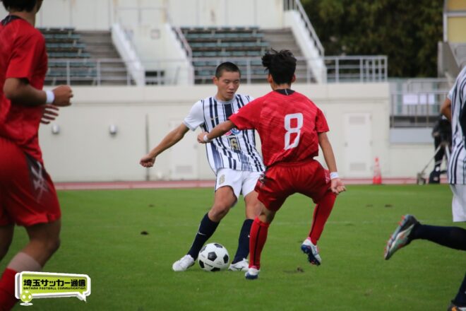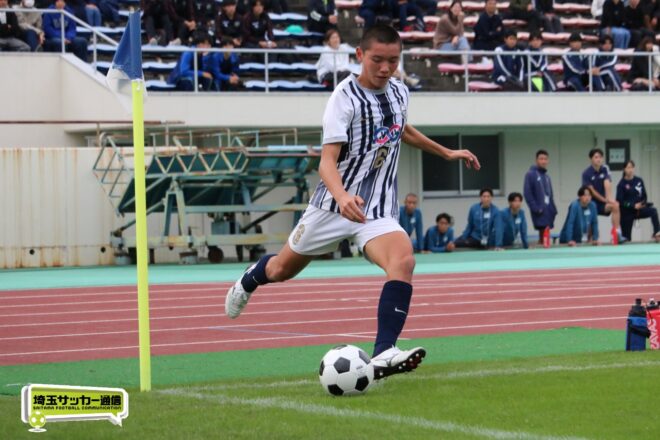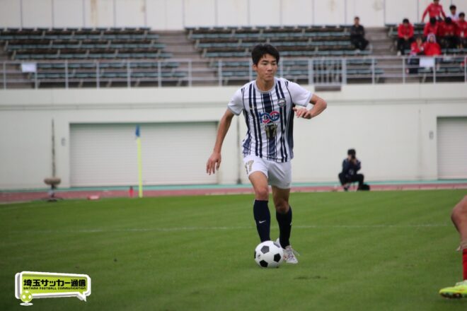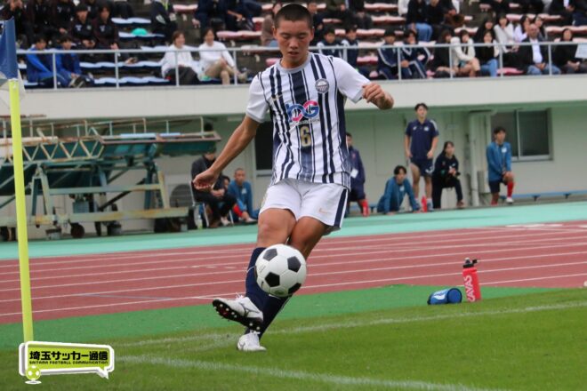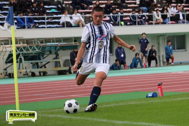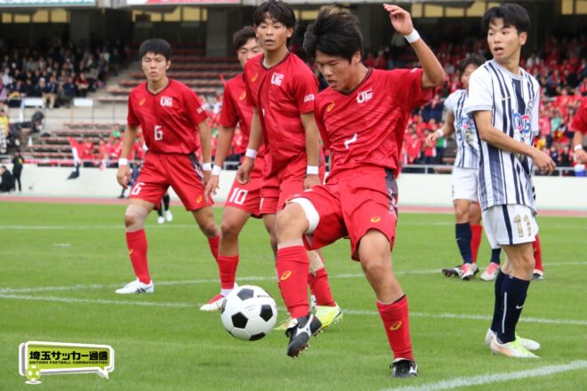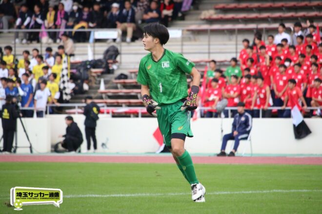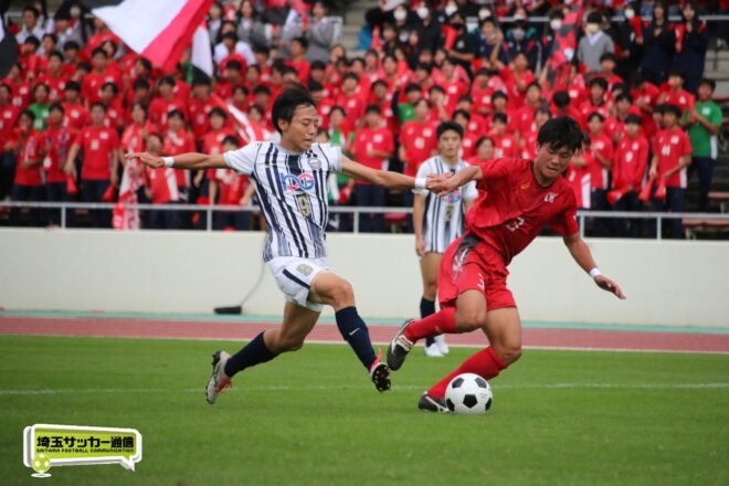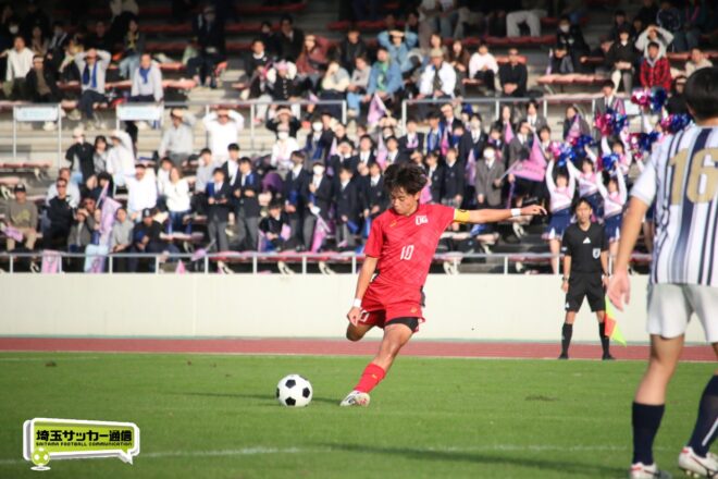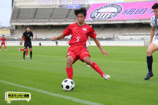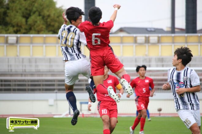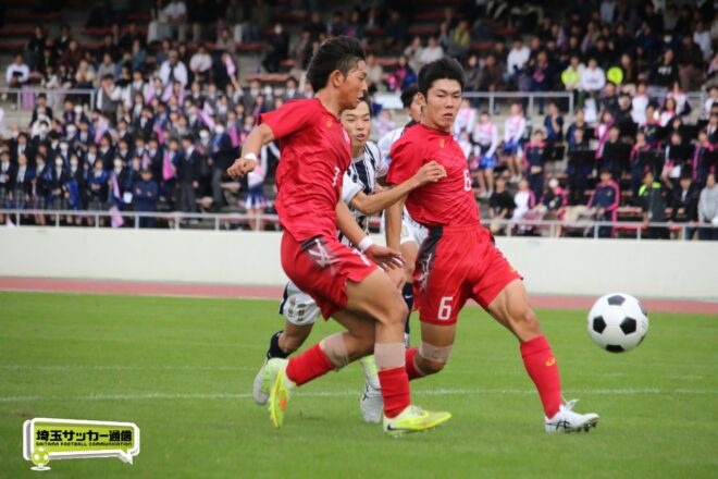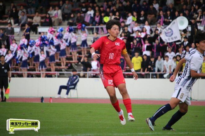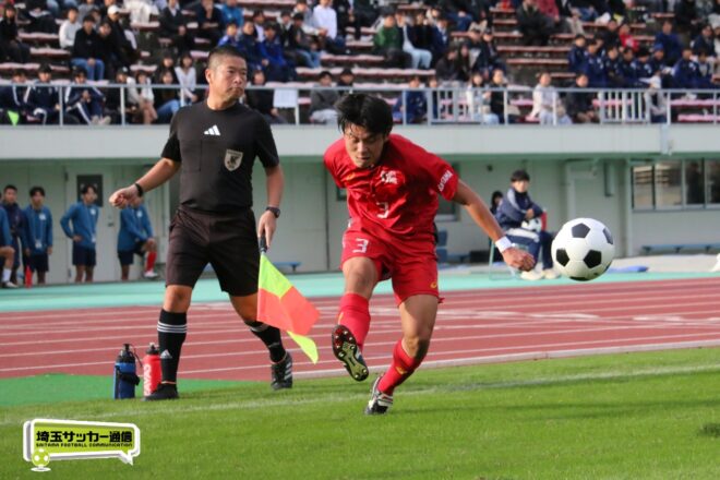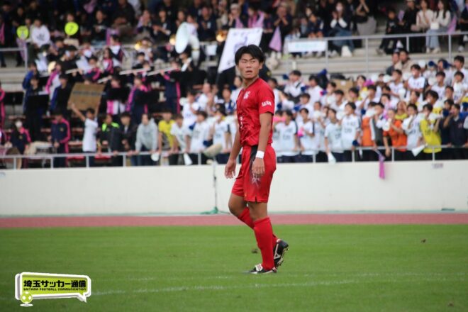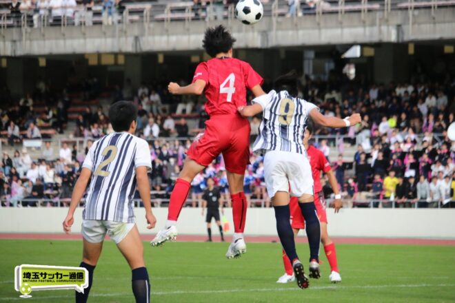 一方、浦和東はFW金響生(3年)、MF谷口大河(3年)、MF藤井慶太(3年)の前線3枚を中心にハイプレス。ロングボールや切り替えの早い攻撃で相手ゴールに迫ろうと試みる。前半14分には中盤でボールを捕まえ、谷口と繋ぎ、藤井が中央から運び出し左足シュートを見舞った。