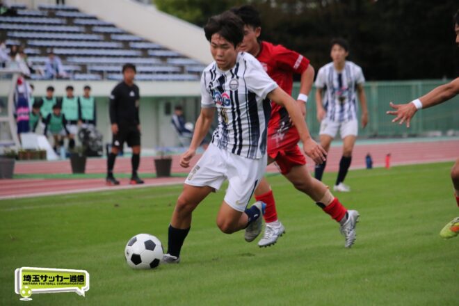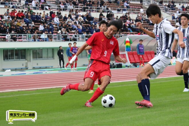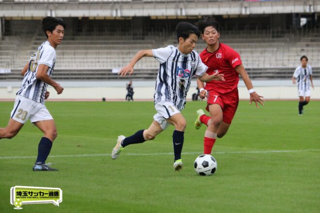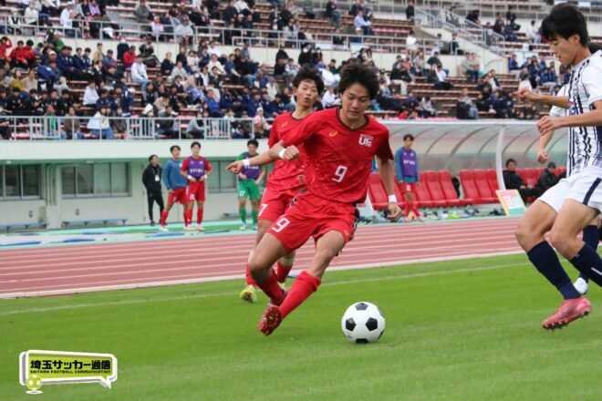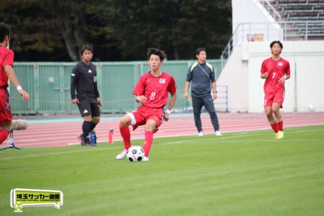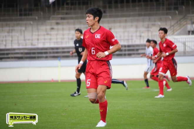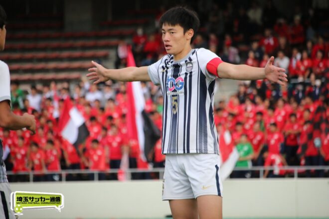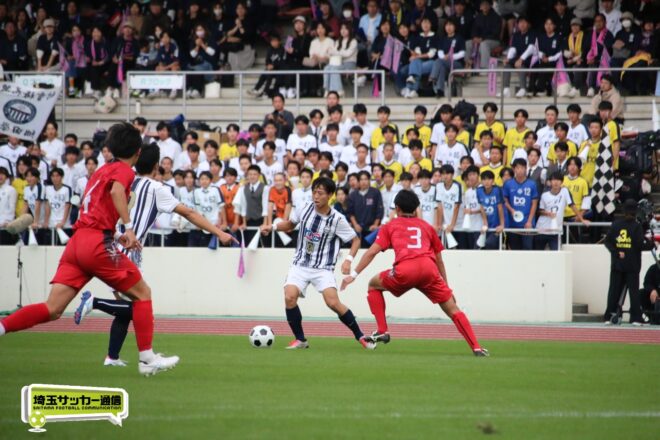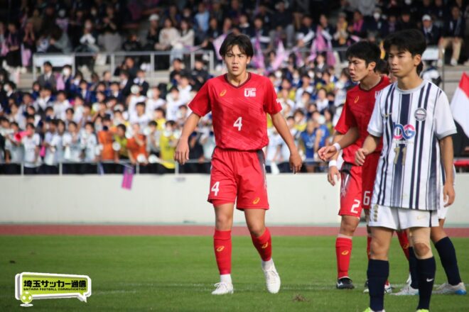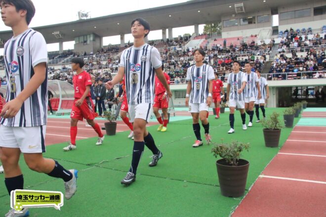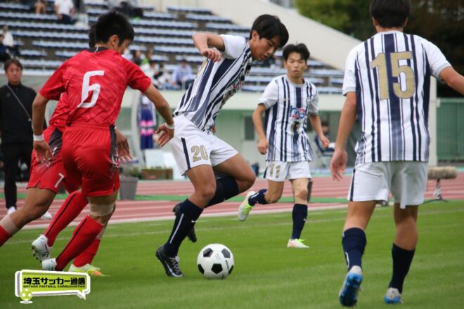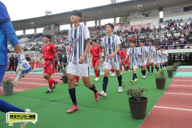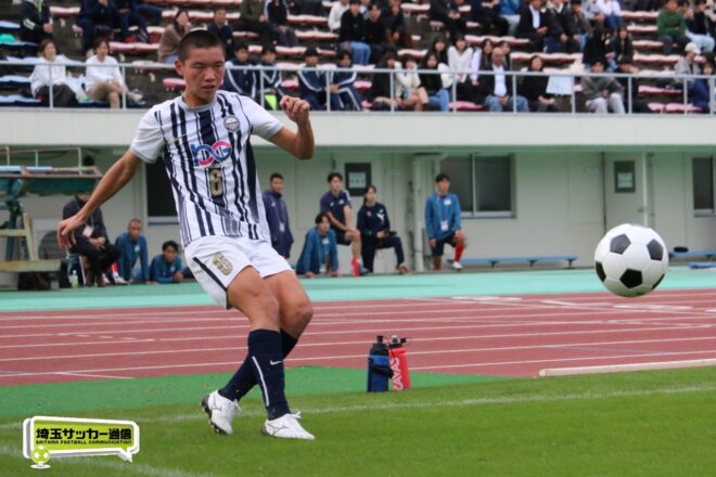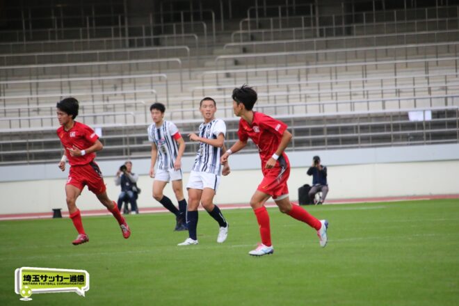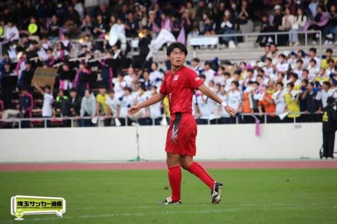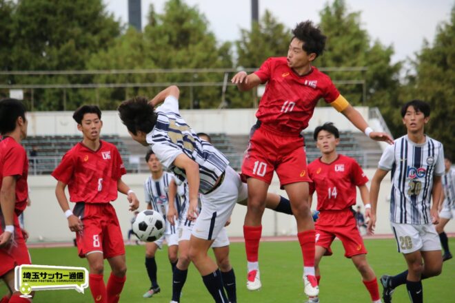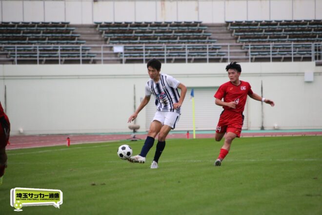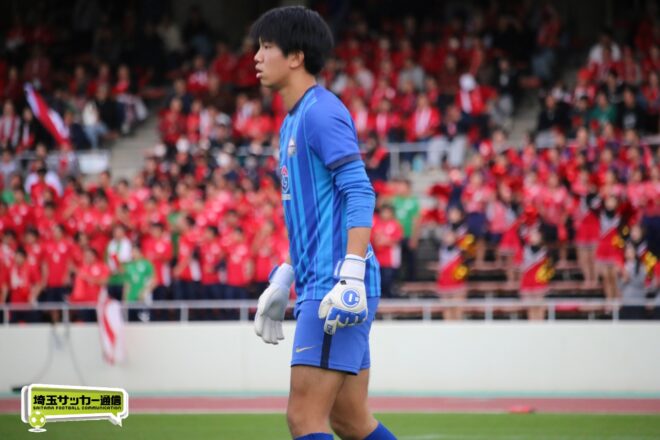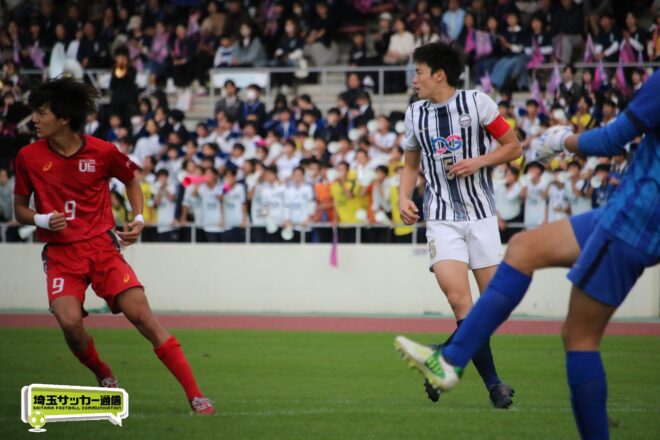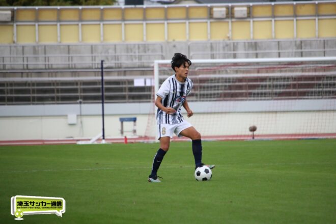 一方、浦和東はFW金響生(3年)、MF谷口大河(3年)、MF藤井慶太(3年)の前線3枚を中心にハイプレス。ロングボールや切り替えの早い攻撃で相手ゴールに迫ろうと試みる。前半14分には中盤でボールを捕まえ、谷口と繋ぎ、藤井が中央から運び出し左足シュートを見舞った。