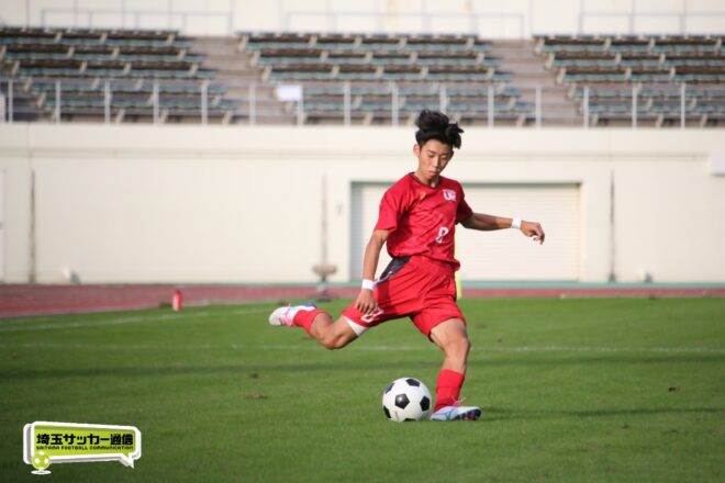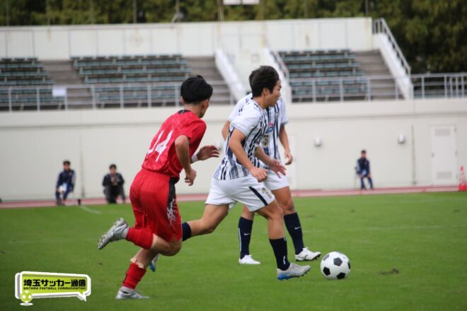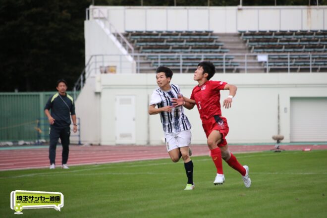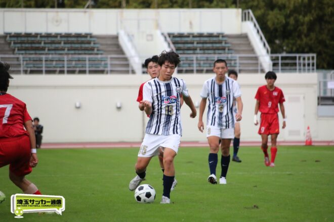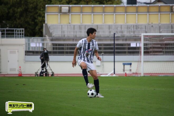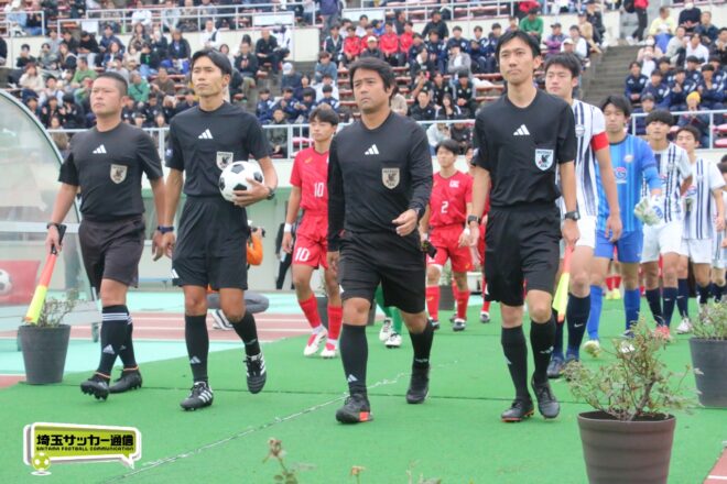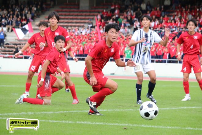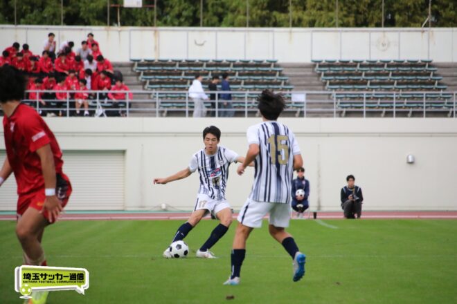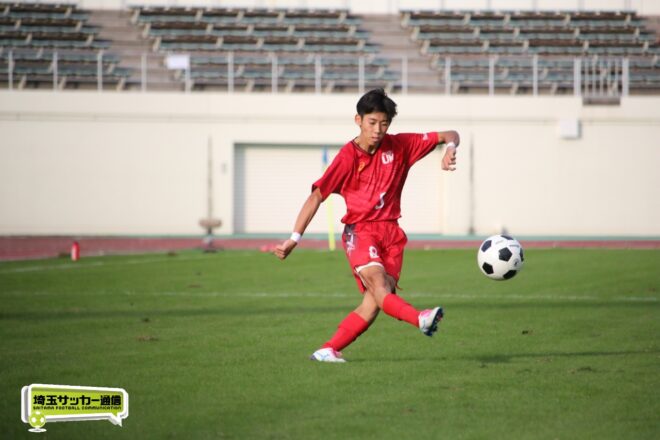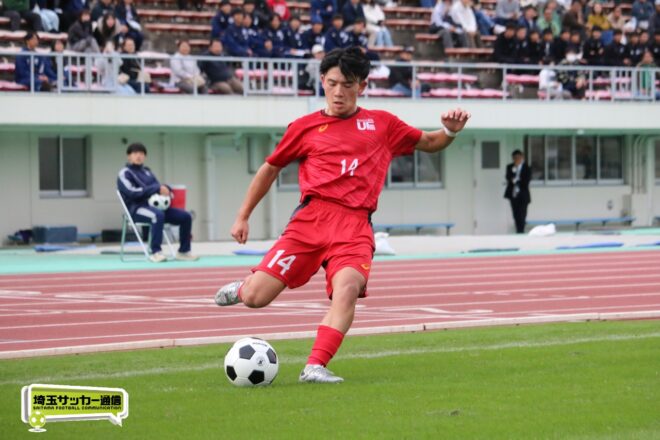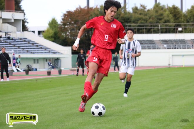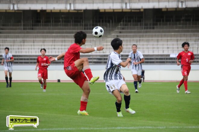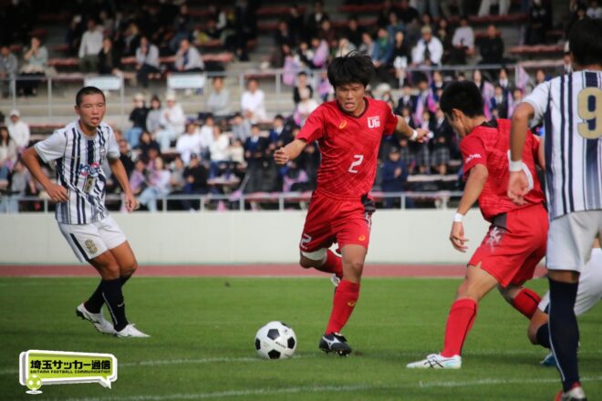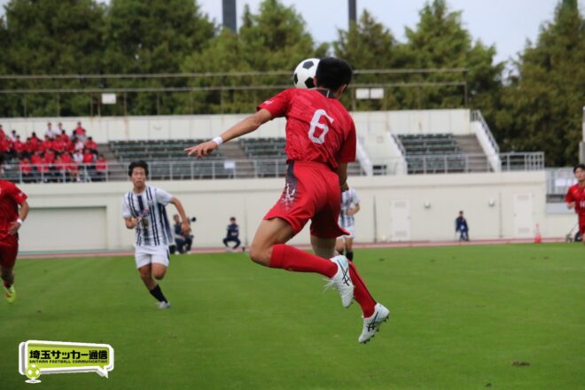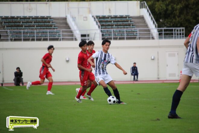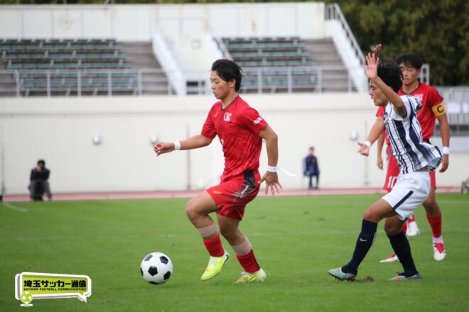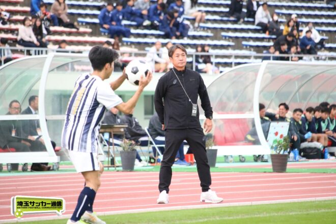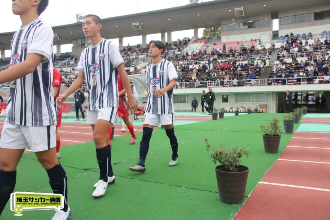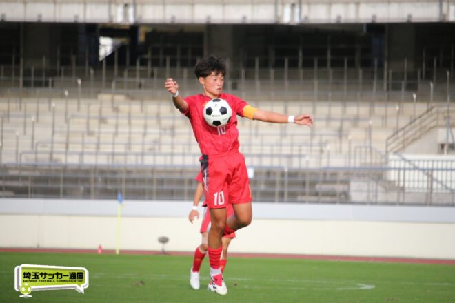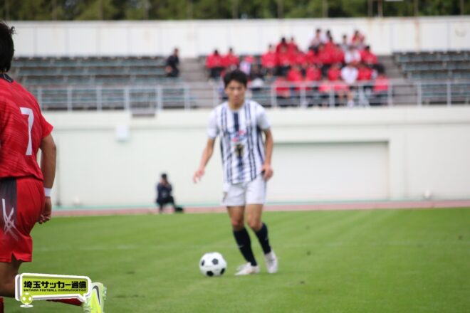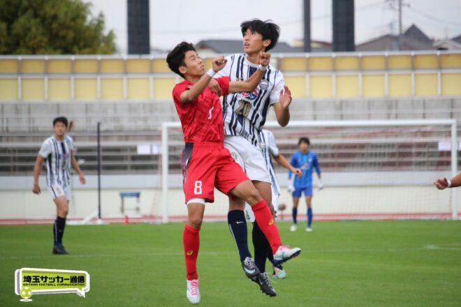 一方、浦和東はFW金響生(3年)、MF谷口大河(3年)、MF藤井慶太(3年)の前線3枚を中心にハイプレス。ロングボールや切り替えの早い攻撃で相手ゴールに迫ろうと試みる。前半14分には中盤でボールを捕まえ、谷口と繋ぎ、藤井が中央から運び出し左足シュートを見舞った。