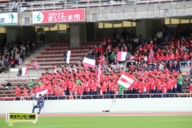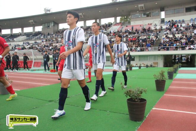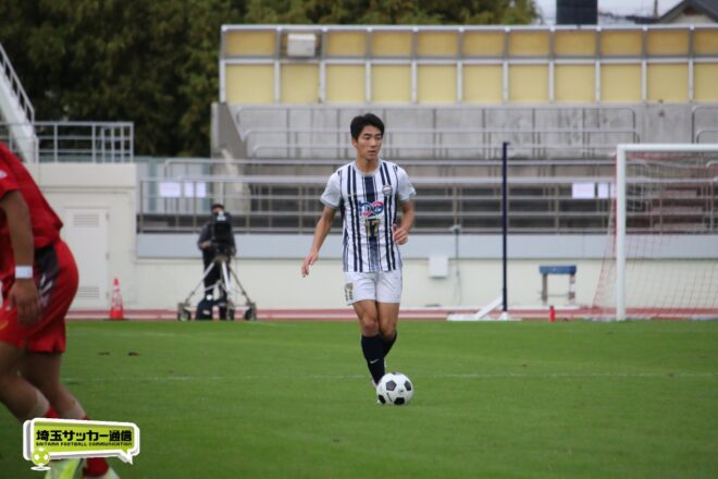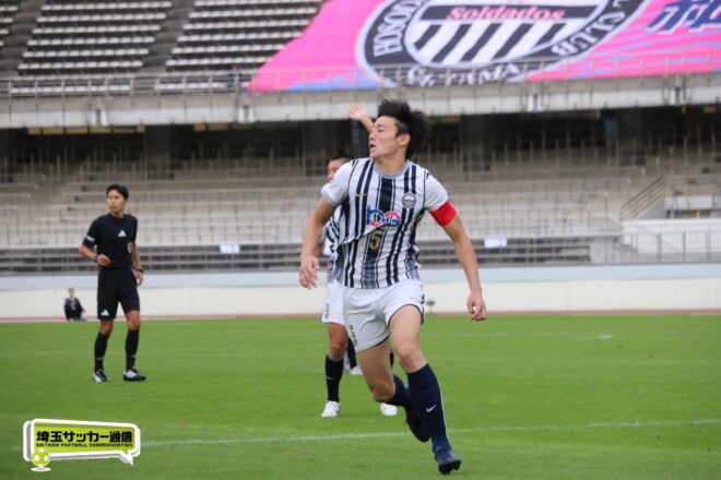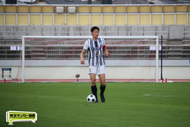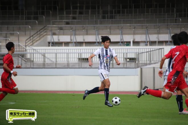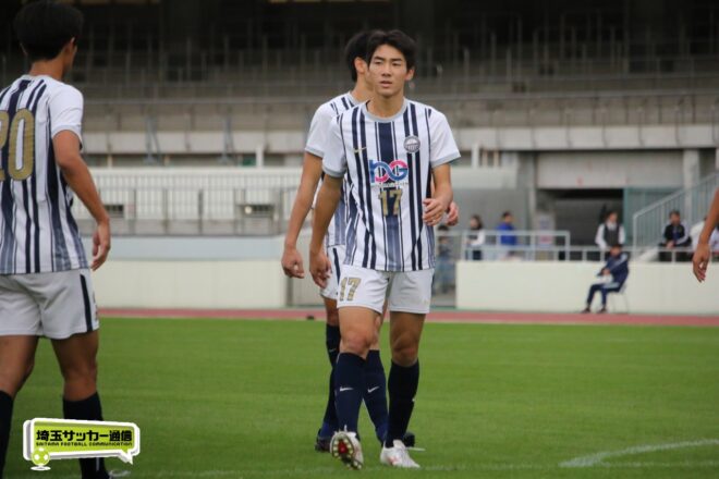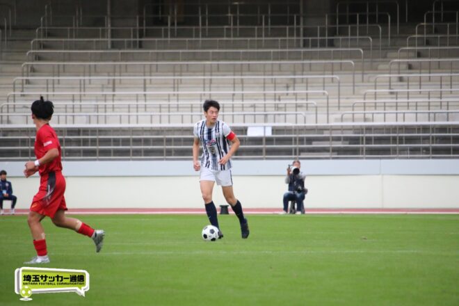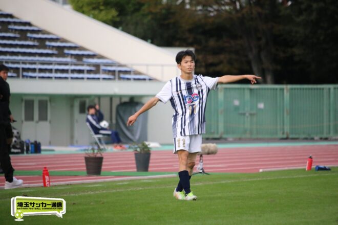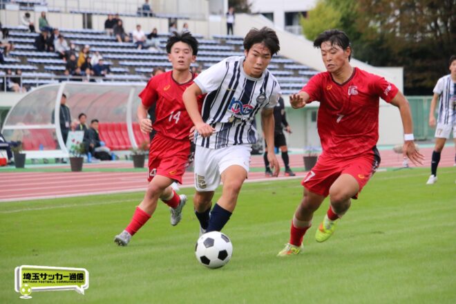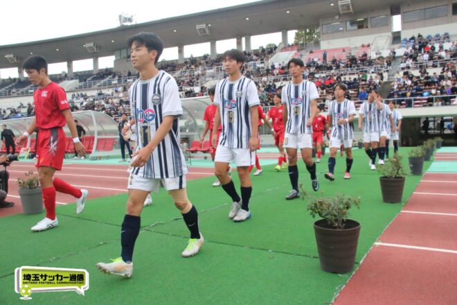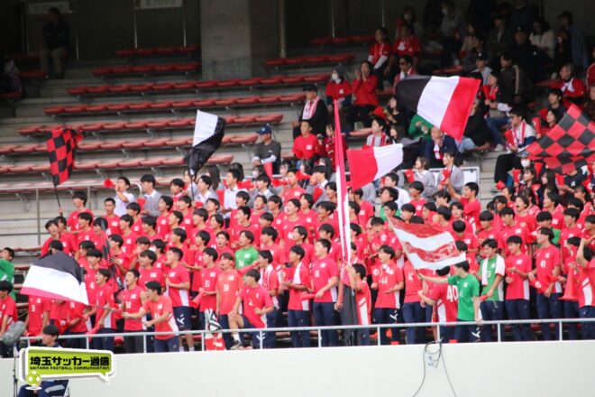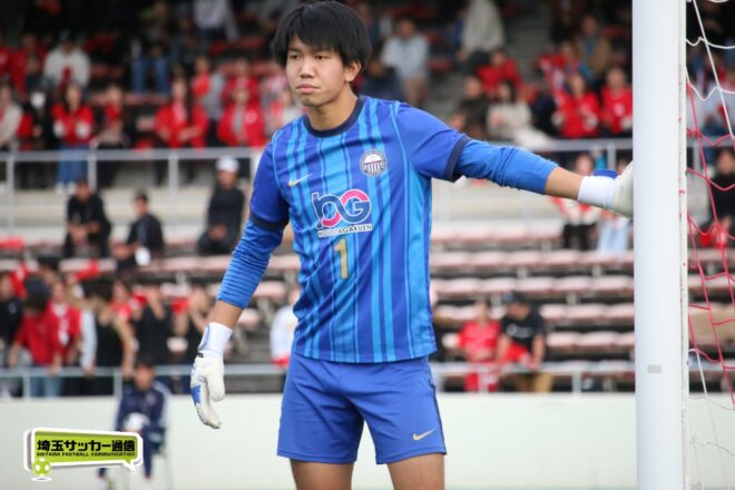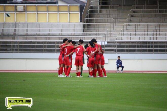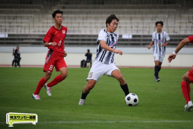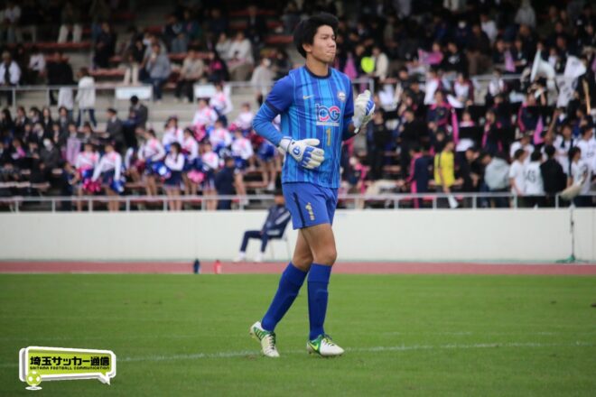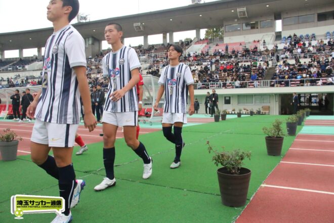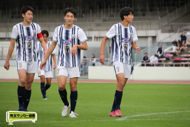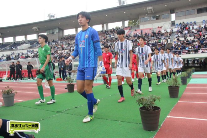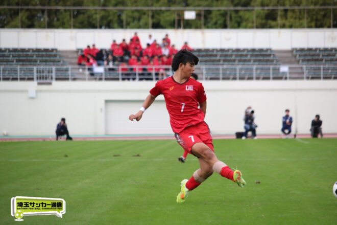 一方、浦和東はFW金響生(3年)、MF谷口大河(3年)、MF藤井慶太(3年)の前線3枚を中心にハイプレス。ロングボールや切り替えの早い攻撃で相手ゴールに迫ろうと試みる。前半14分には中盤でボールを捕まえ、谷口と繋ぎ、藤井が中央から運び出し左足シュートを見舞った。