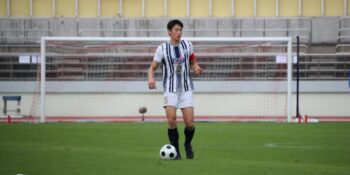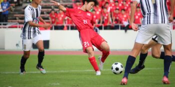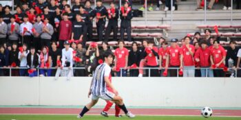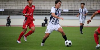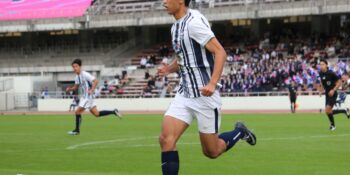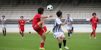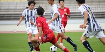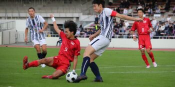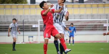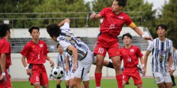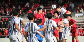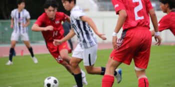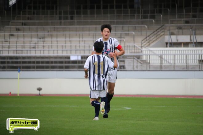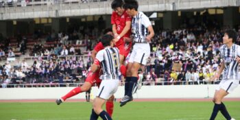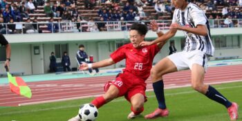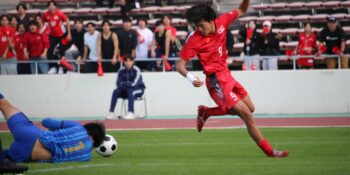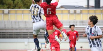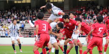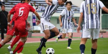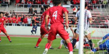 すると後半は立ち上がりから押し込み、そこで連続してチャンス。2分に藤井が左サイドを抉り、クロスから10番MF永田隼(3年)主将がシュート。5分には藤井のFKから足立がヘディングで迫る。これは惜しくもゴールとはならなかったが、10分、MF滝川弦生(3年)の右CKから足立がヘッド。こぼれ球を追撃したMF佐々木佑輝(3年)が押し込んで先制に成功する。