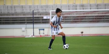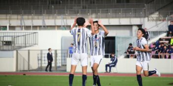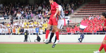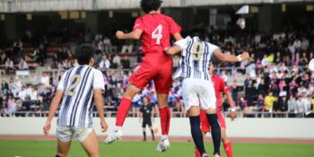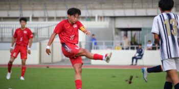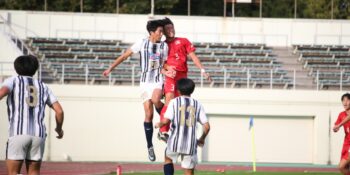 それでも細田学園はここで崩れず。16分、右CKからのこぼれ球をDF辻葵仁(2年)が中央に折り返すと、1トップのFW松本隼翔(2年)が頭でプッシュしてすぐさま同点に追いつく。