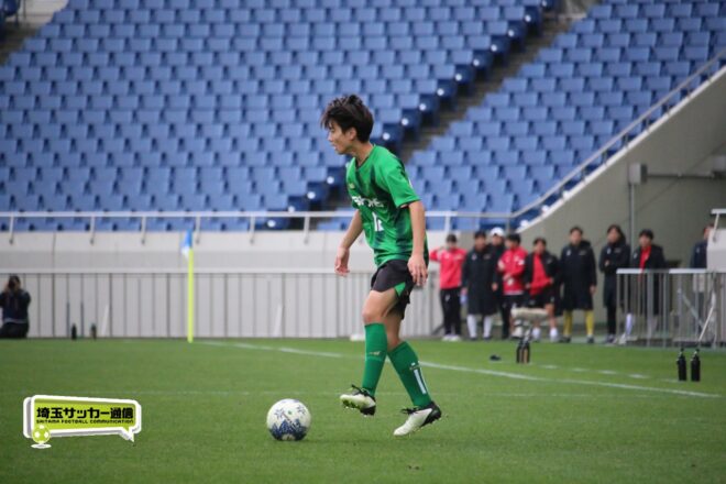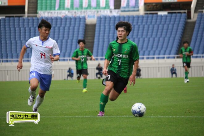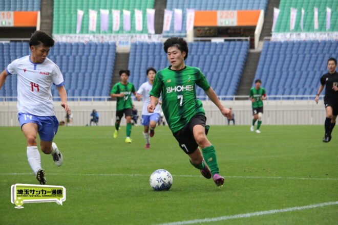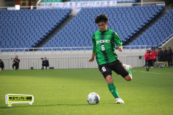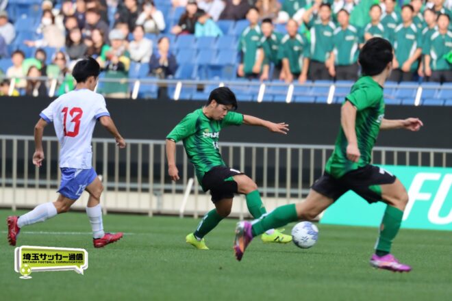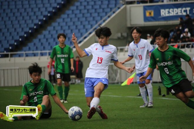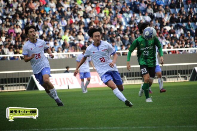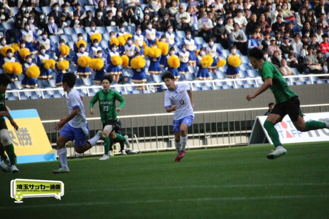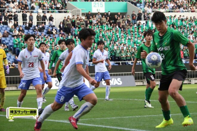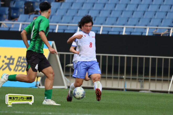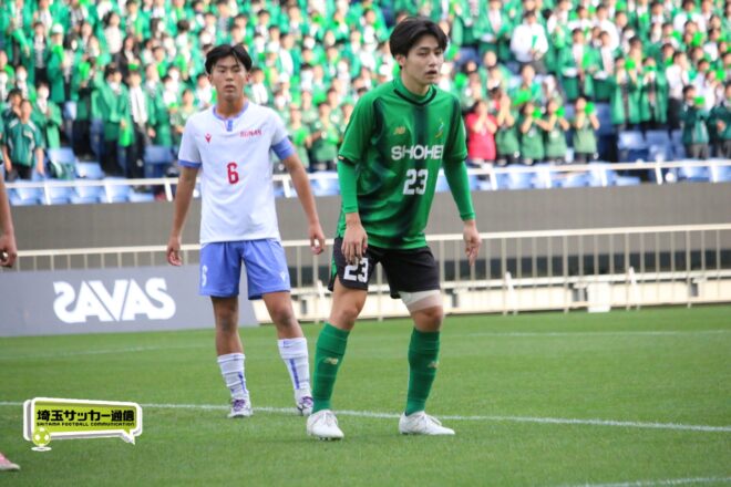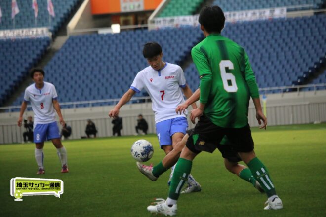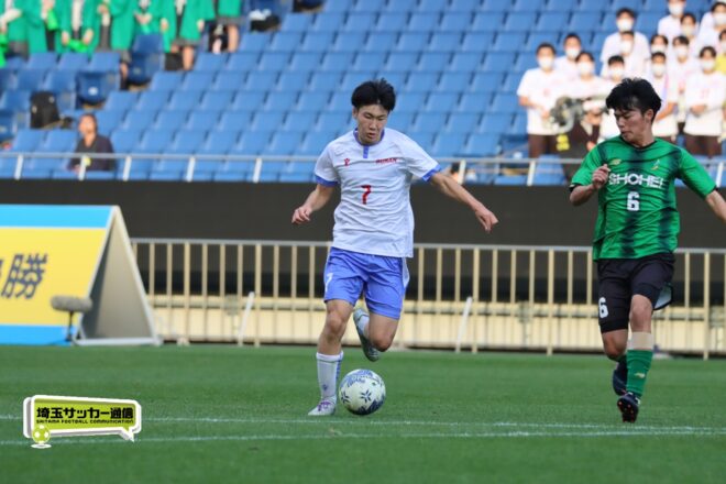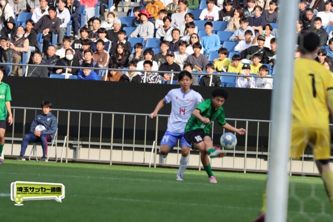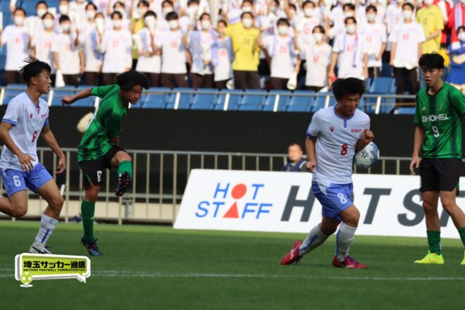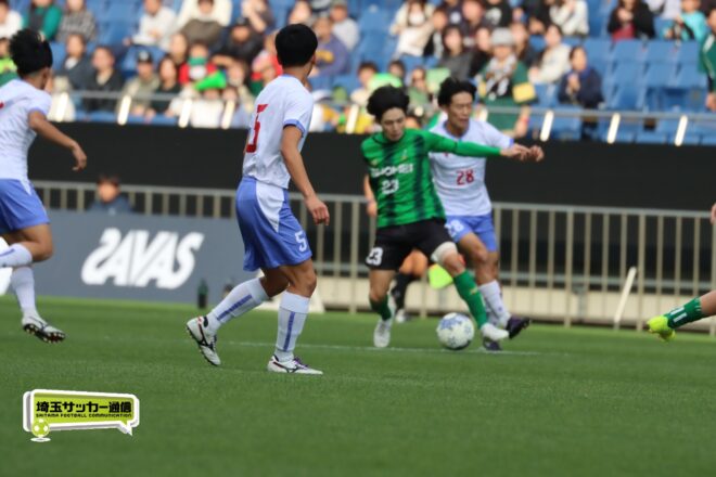 武南は22分、右サイドの攻撃でSBの田中理月(3年)のフィードからMF関口海龍(3年)が裏に走り込み、切り返してクロス。準決勝で決勝ゴールを挙げたMF平野琉斗(3年)主将がゴール前に入り込んで右足でシュートを狙っていく。昌平も準決勝に続き、2戦連続のスタメン出場となった左SB古川雄規(2年)の縦パスから長が右足シュートでゴールに迫った。