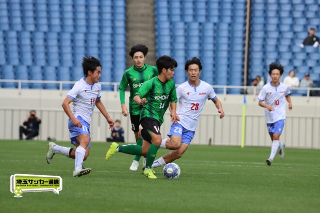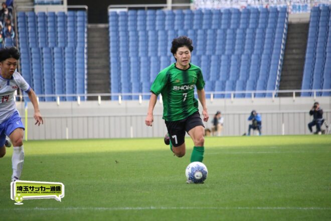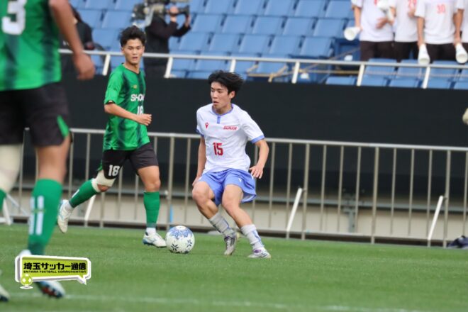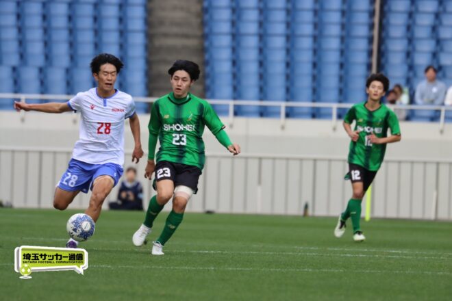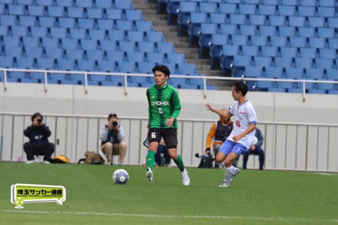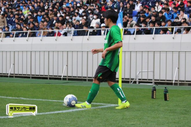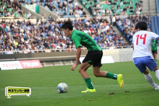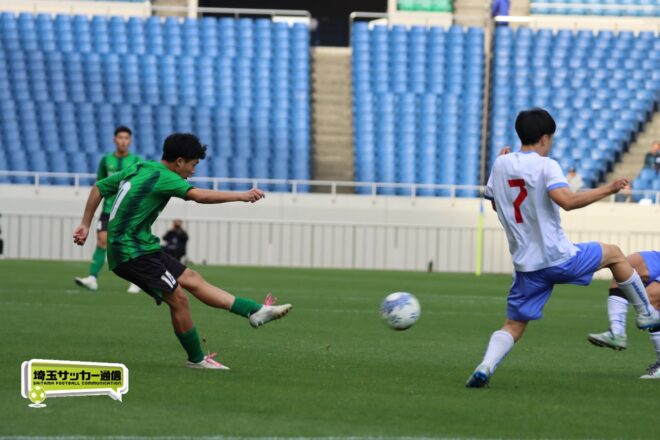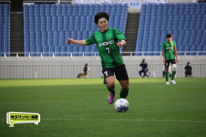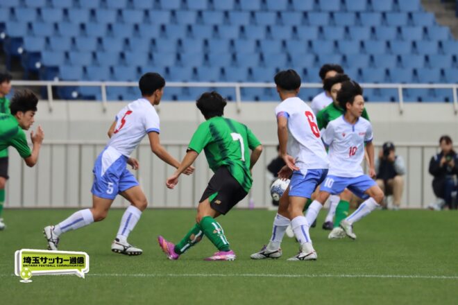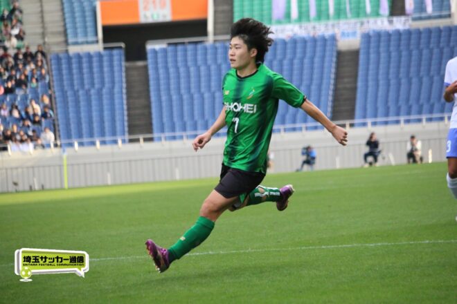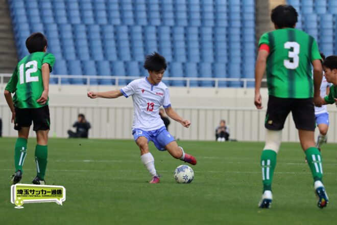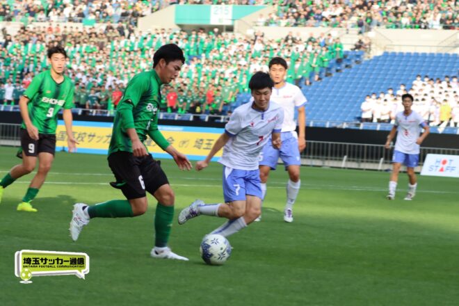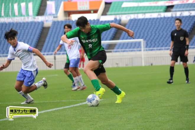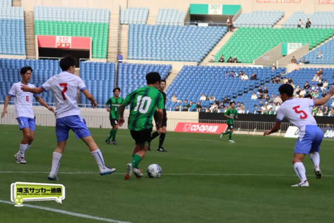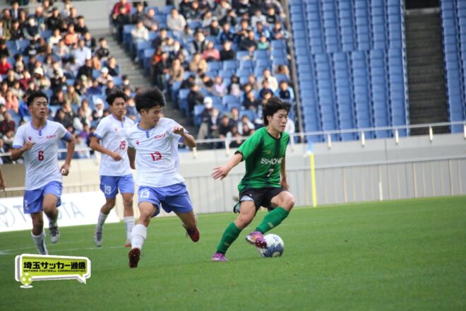 武南は22分、右サイドの攻撃でSBの田中理月(3年)のフィードからMF関口海龍(3年)が裏に走り込み、切り返してクロス。準決勝で決勝ゴールを挙げたMF平野琉斗(3年)主将がゴール前に入り込んで右足でシュートを狙っていく。昌平も準決勝に続き、2戦連続のスタメン出場となった左SB古川雄規(2年)の縦パスから長が右足シュートでゴールに迫った。