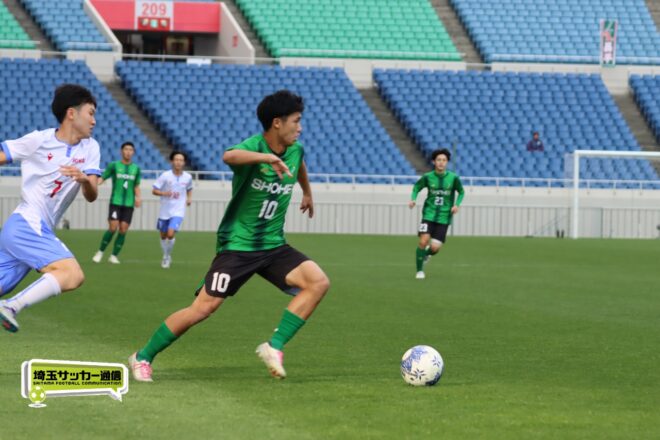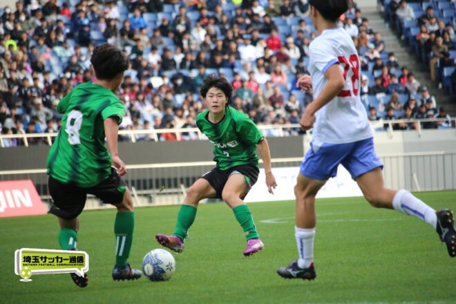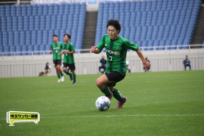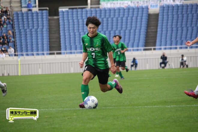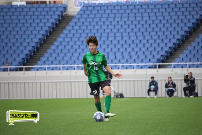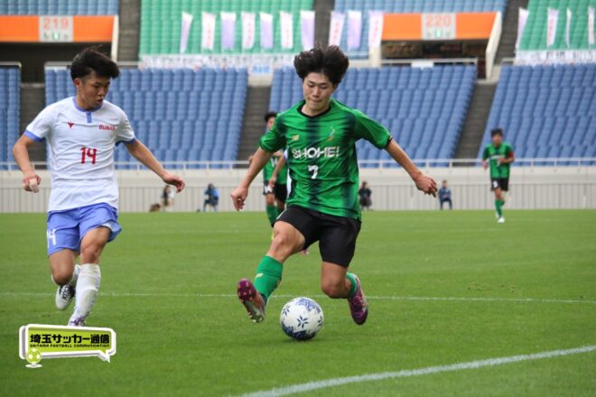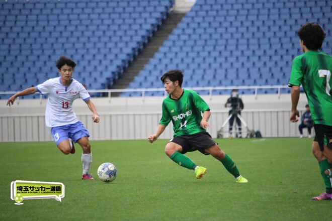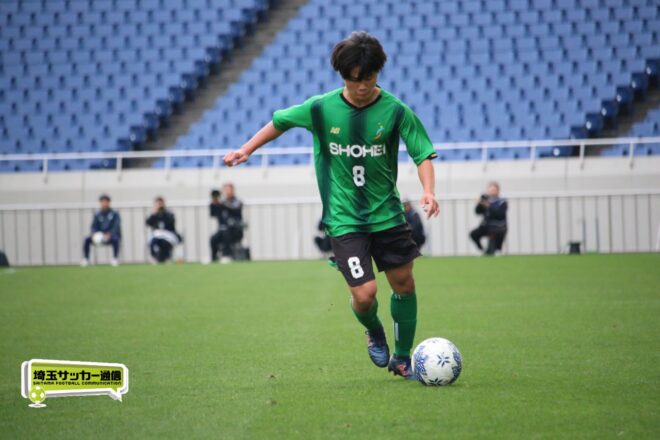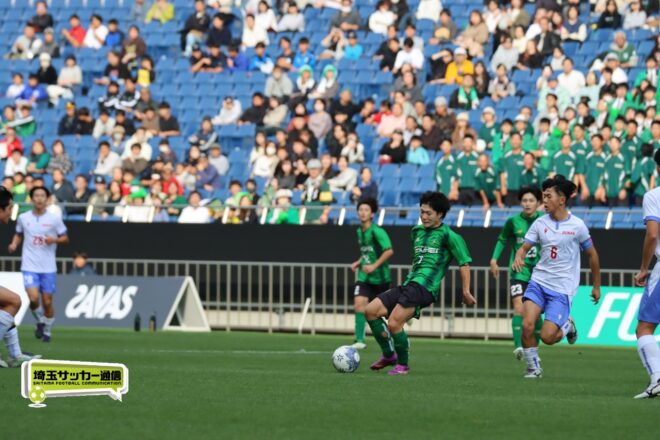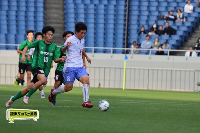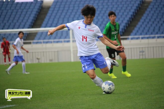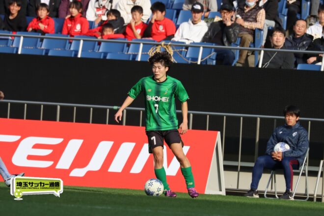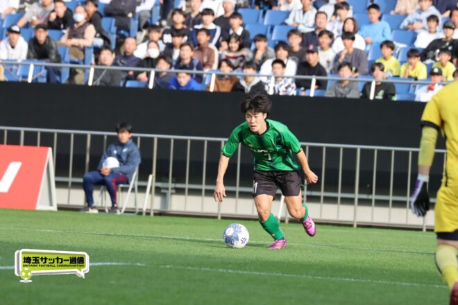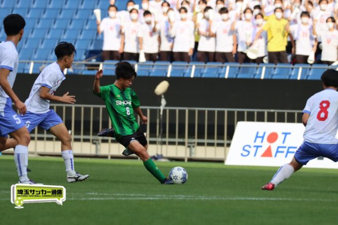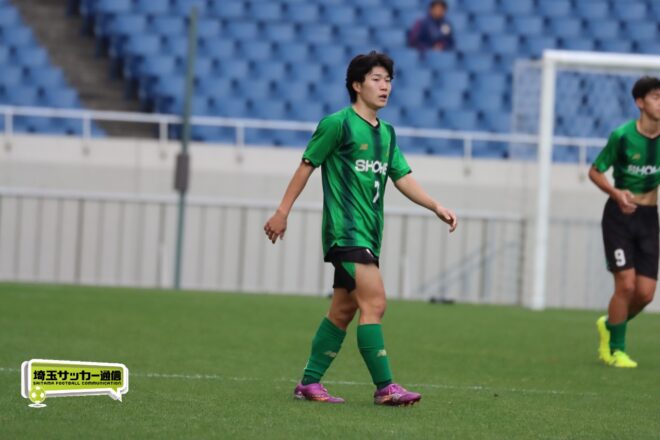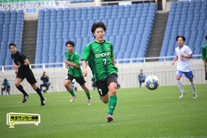 武南は22分、右サイドの攻撃でSBの田中理月(3年)のフィードからMF関口海龍(3年)が裏に走り込み、切り返してクロス。準決勝で決勝ゴールを挙げたMF平野琉斗(3年)主将がゴール前に入り込んで右足でシュートを狙っていく。昌平も準決勝に続き、2戦連続のスタメン出場となった左SB古川雄規(2年)の縦パスから長が右足シュートでゴールに迫った。