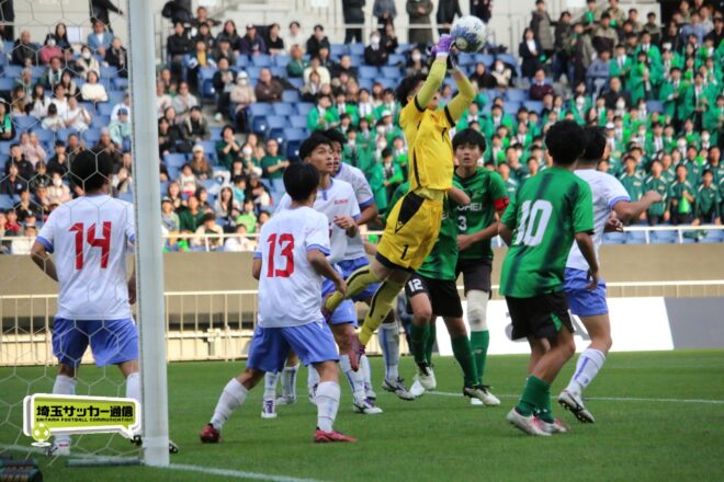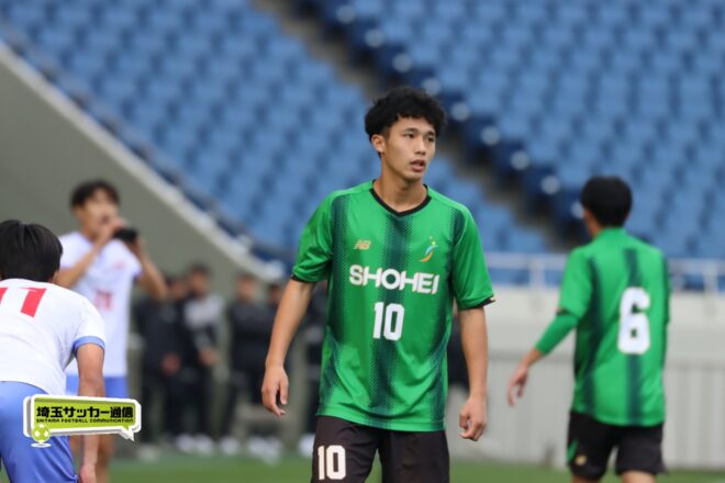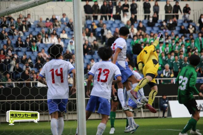 武南は小山が果敢にドリブルで持ち上がりチームを進めるプレー。10分には平野のボールカットから有川がカットインシュートを狙っていく。昌平は12分、古川の縦パスに湘南内定の10番MF山口豪太(3年)が完全に抜け出したかと思われたが、シュートは武南DF倉本健二(3年)が決死のブロック。武南は13分、有川が狙うが、小野寺がしっかりとキャッチした。
