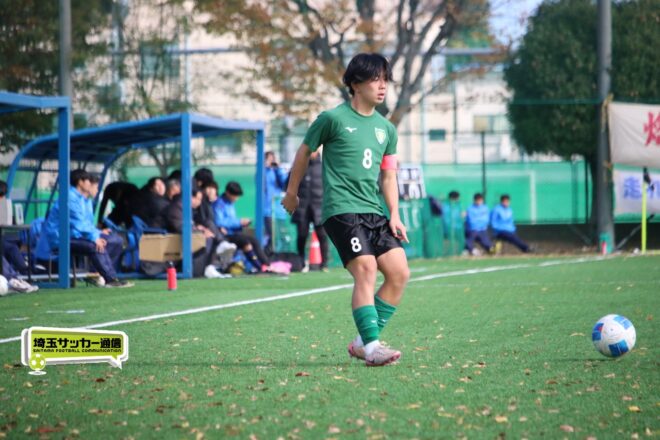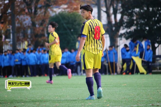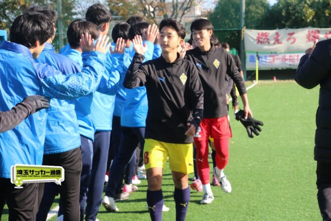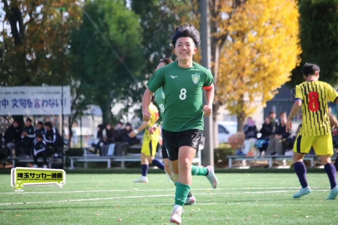 苦しい時間の続いた武蔵越生だったが、小林やDF横溝龍太(2年)、DF白岩武琉(3年)のCBコンビを中心に無失点で凌ぐ。すると16分、ゴール前でGKとディフェンスラインの連携ミスを見逃さなかったMF中嶋修斗(3年)主将が奪い、左足で無人のゴールに流し込んだ。