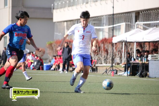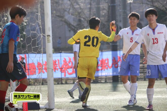 成徳深谷はHT明けから10番FW関根大和(3年)を投入。後半3分にはMF鯨井遥翔(3年)がエリア内に切り込んで決定機を迎えたが、笠井がここも1対1を阻止した。すると武南は6分、藤森が相手DFを背負い、3列目から飛び出した小山がゴール右に沈めて追加点とした。