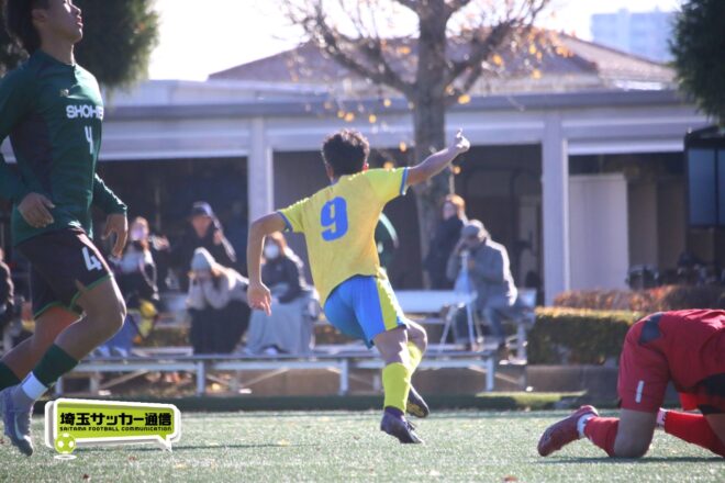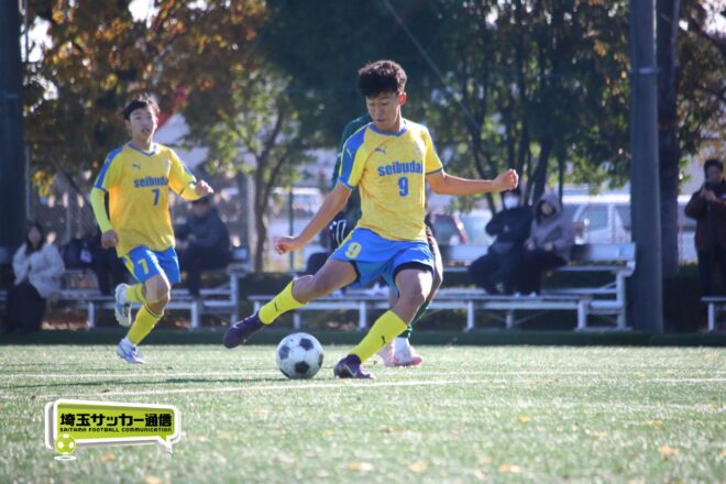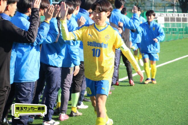 逆転タイトルを狙う西武台は立ち上がりから、前線からプレスを掛けて相手のビルドアップミスを誘い、そこからアタック。前半7分にはFW小山田康泰(2年)がディフェンスのバックパスを奪うと、タッチでさらにディフェンスを交わし、最後はGKとの1対1を沈めて先制した。