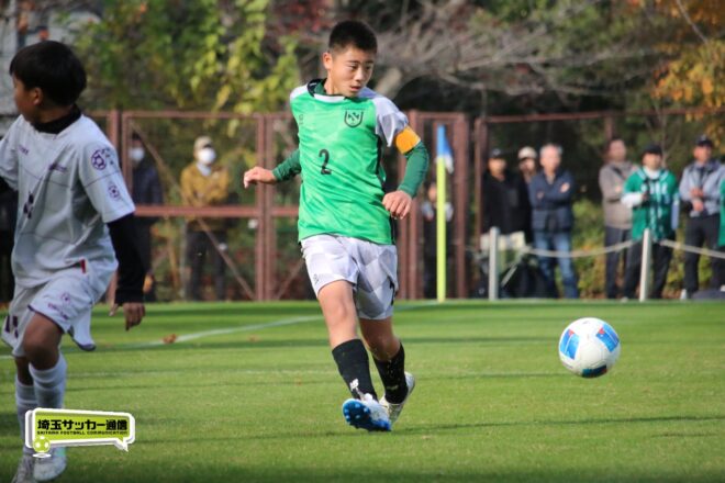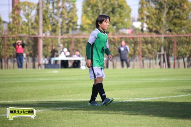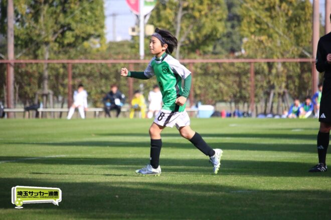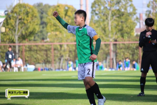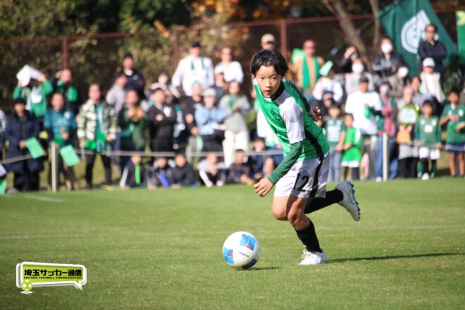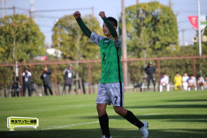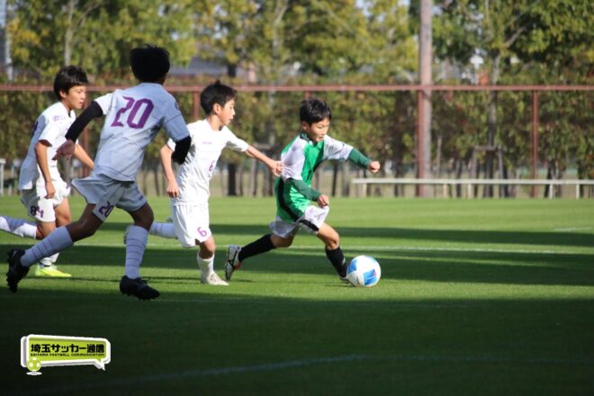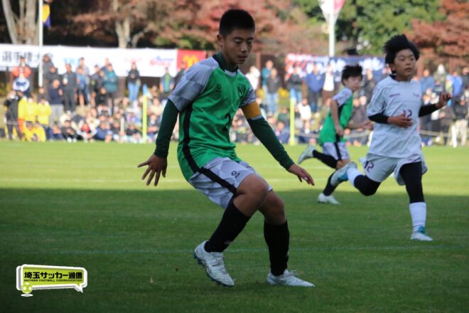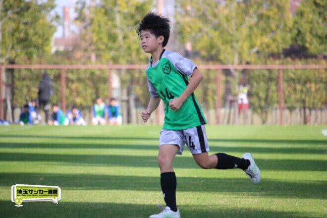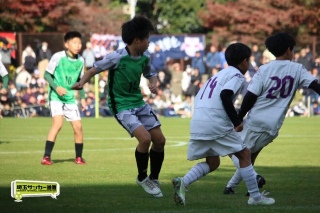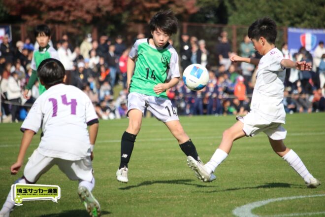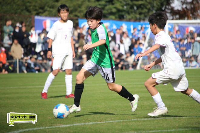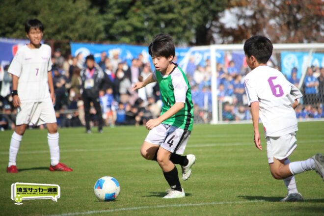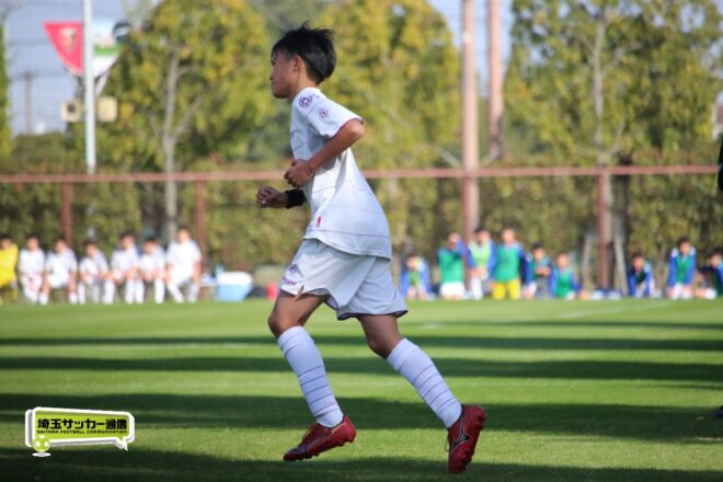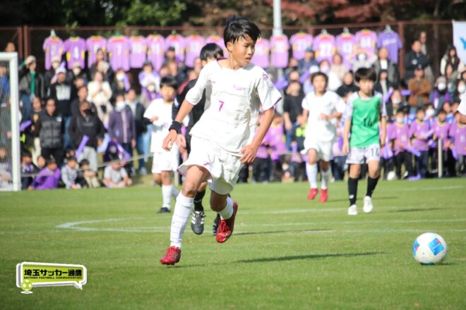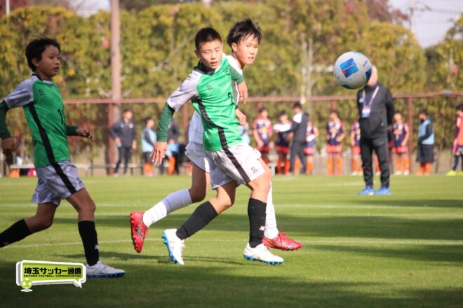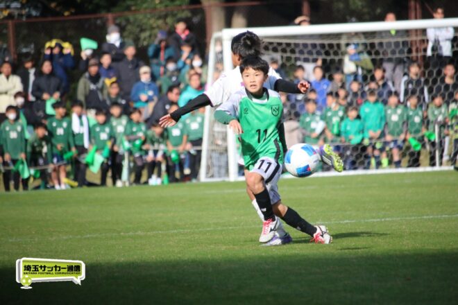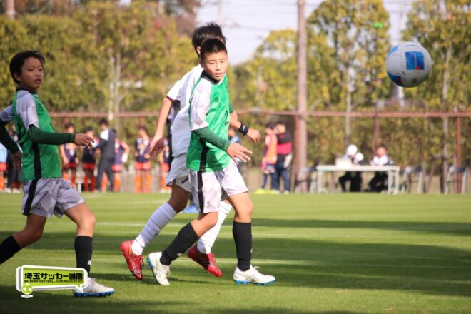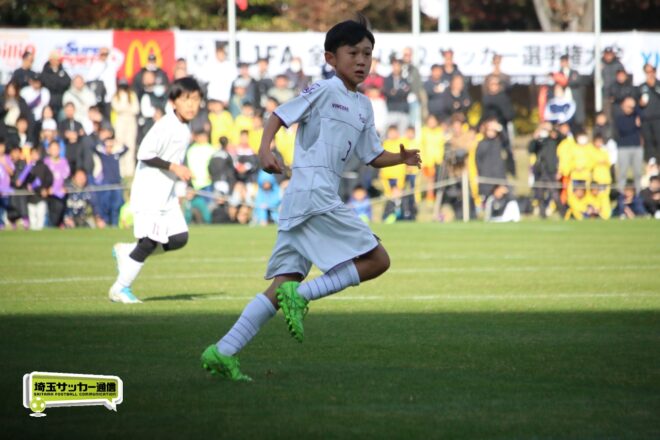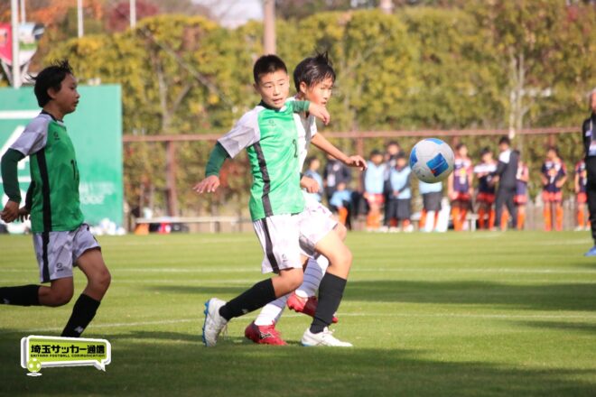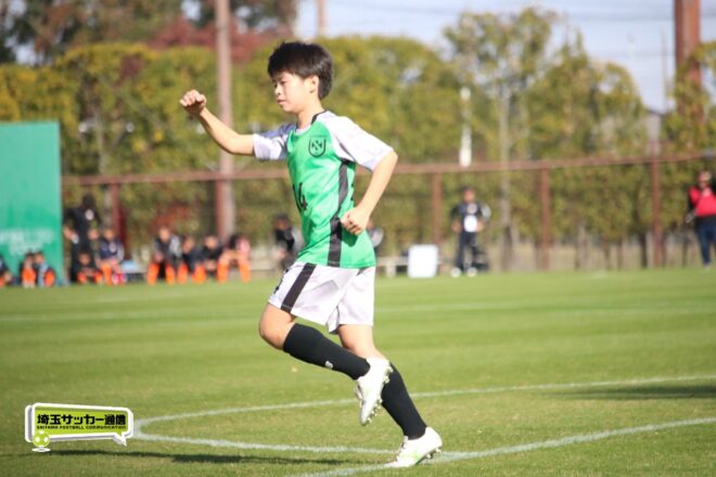 敵陣での時間を増やすと、新座片山FC少年団は11分、クロスのこぼれ球を岩沢瑛之(6年)がゲット。さらに1分も立たずに同点ゴールが生まれる。梶が持ち味のスピードを発揮して縦突破し、中に折り返したボールを小林大地(6年)がゴールに流し込んでスコアをタイに戻した。