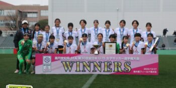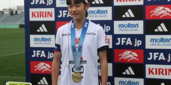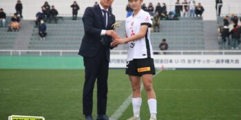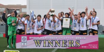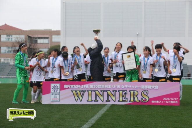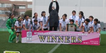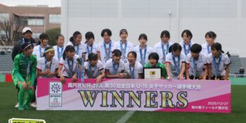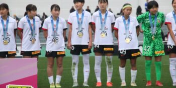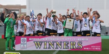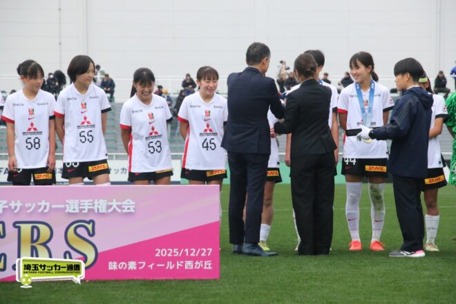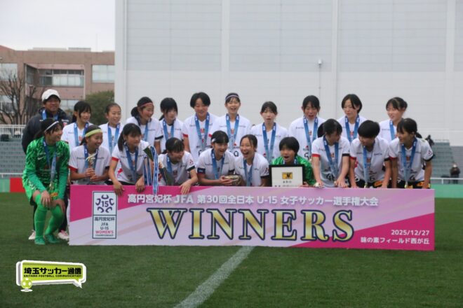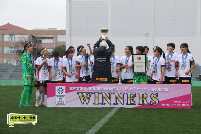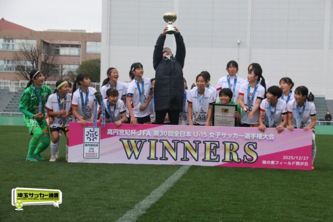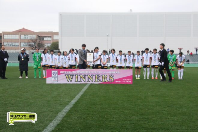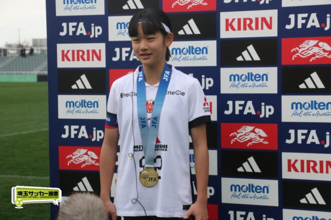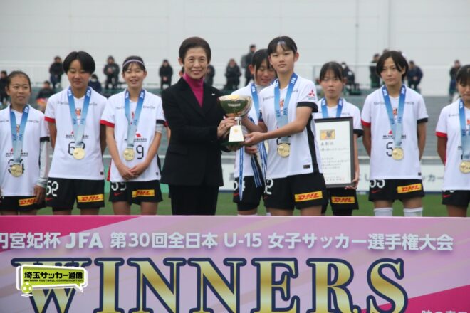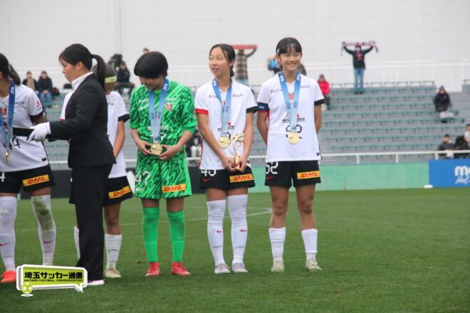 17分には増田のパスから徳生が右足シュートで狙う。20分にクロスバーを叩いた相手のFKには肝を冷やしたが、27分には河合がドリブルで持ち出しスルーパスから仙石が決定機を作った。相手ゴールに連続して迫ると33分、浦和は左スローインの展開から片岡がクロス。これを徳生が大会6点目となるヘディングを決めて勝ち越しに成功する。終盤は1点を負う神戸の攻勢を抑え、昨年涙を流したピッチで見事リベンジ。6大会ぶりとなる女子中学年代の日本一に輝いた。