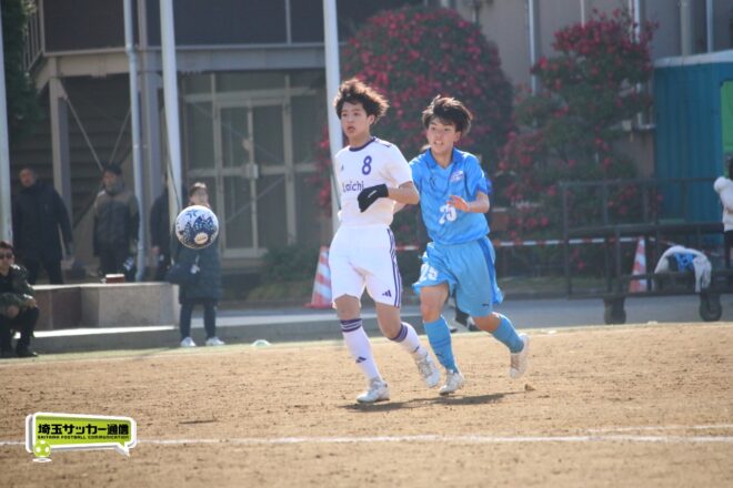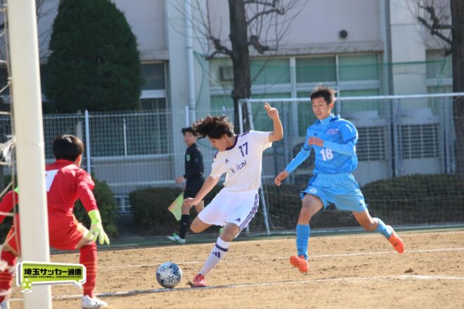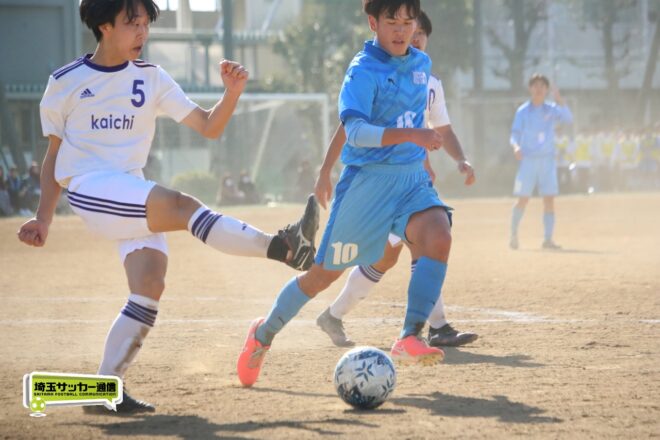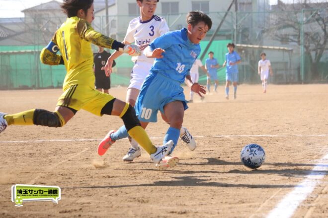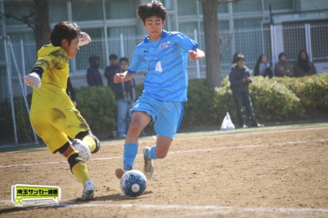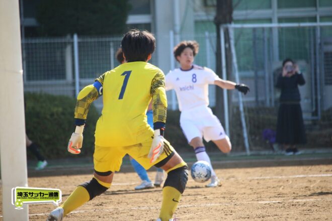 一方、前半シュート0本に終わった開智中高は後半17分にビッグチャンス。MF安藤慶祐(1年)が抜け出し1対1を迎えたが、川口北は井出がゴールカバーに入りネットは揺らせない。
