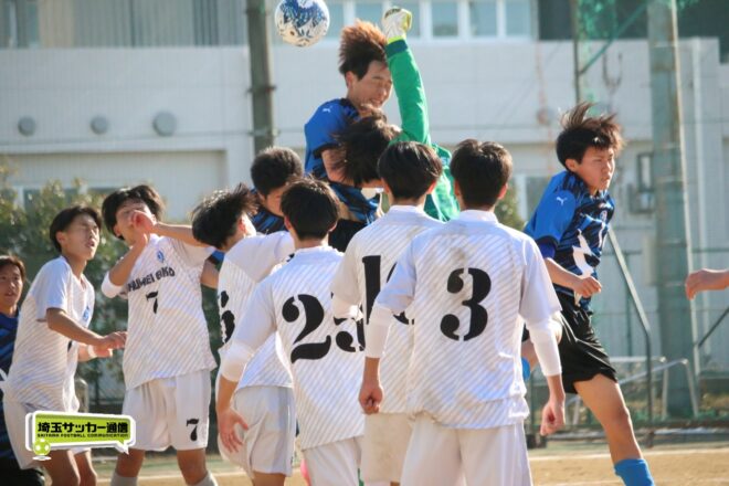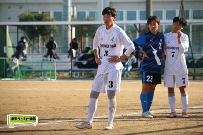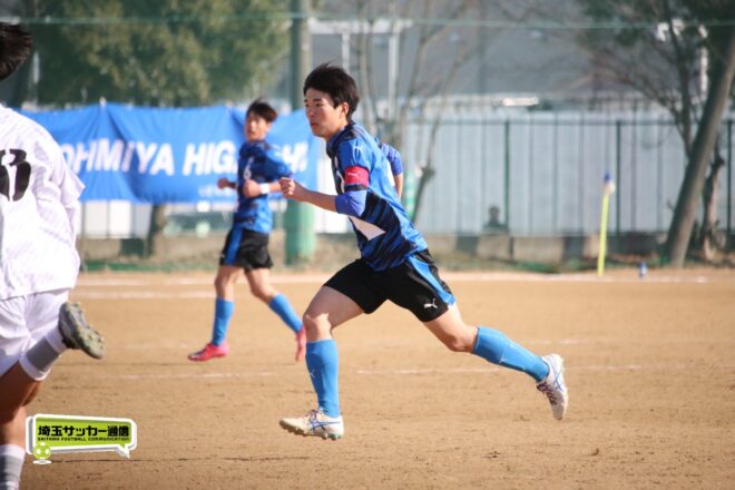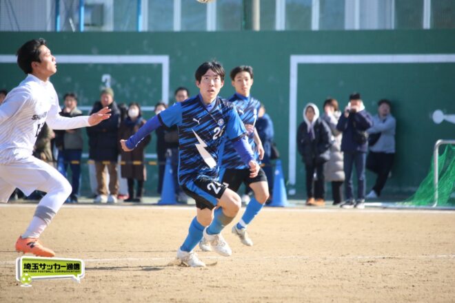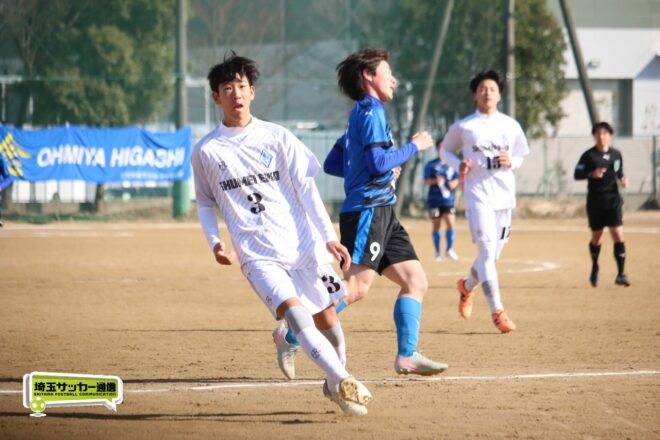 大宮東は前半9分、エリアに抜けたFW大西光(1年)のシュートがクロスバーを強襲。23分にはゴールキックから大西がフリックし、FW後藤廉(2年)がゴールに迫る。37分にはMF坪内健汰(1年)が決定機を迎えたが、秀明英光は松田がカバーに入り、ゴールは割らせなかった。