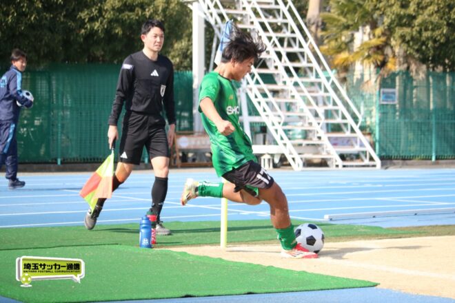 さらに9分には、初戦の花咲徳栄戦では直接CK弾を叩き込んだ10番MF高本創司(2年)の右CKがクロスバーに跳ね返る。こぼれを拾ったFW八尋祐有(2年)がゴール前の混戦にクロスを供給。これをMF永井颯祐(2年)がヘディングで触って追加点を奪うことに成功した。